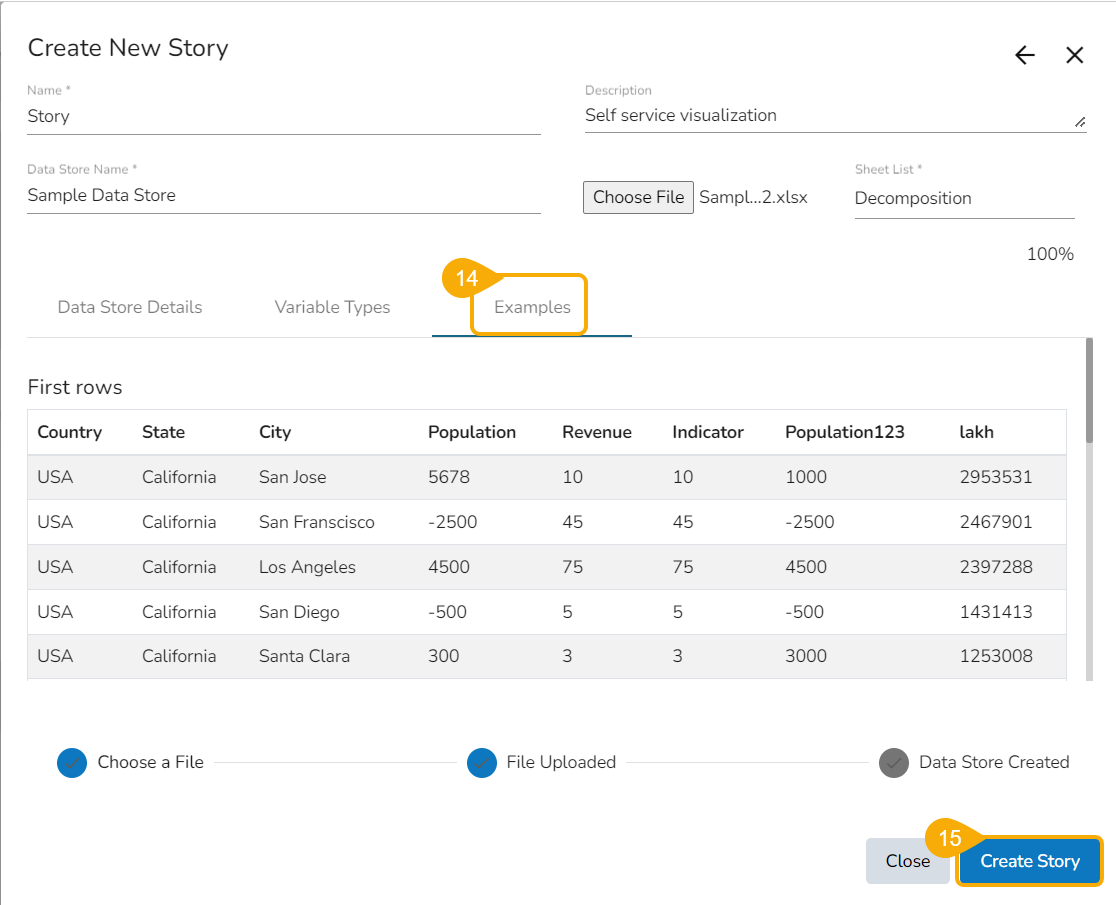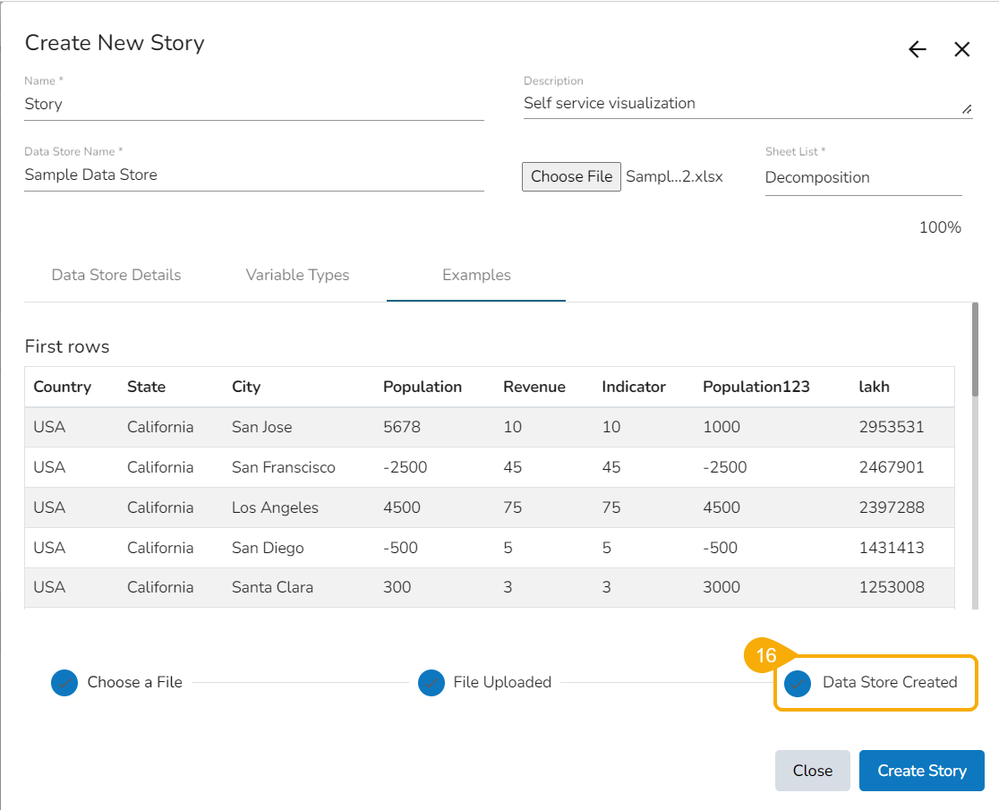 This page describes steps on how upload a CSV file to create a New Story. The user can try this functionality themselves by using the sample file.
