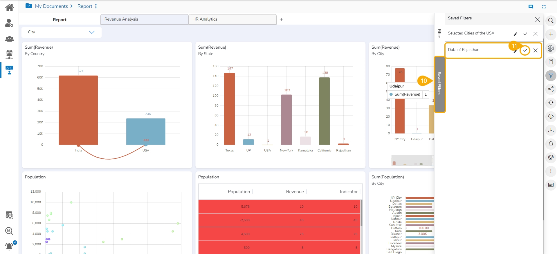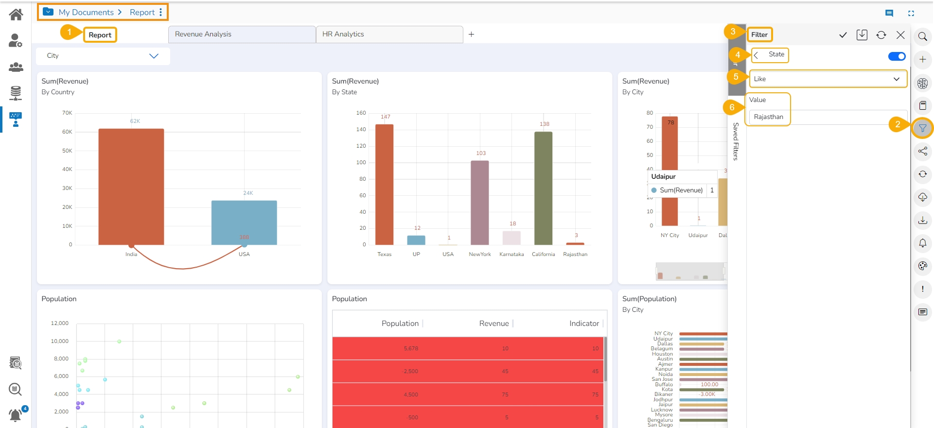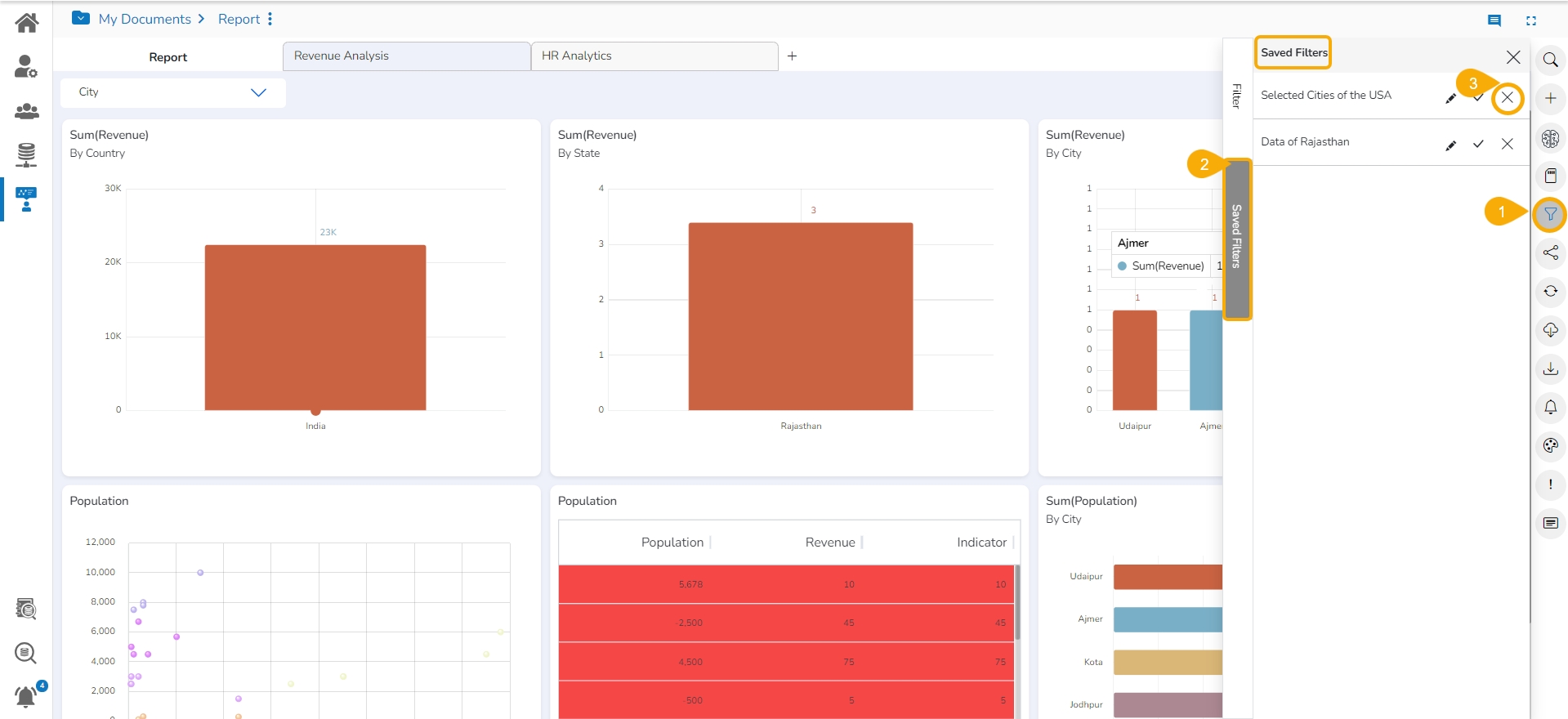 The saved global filter condition gets applied to the concerned Views of a Report.