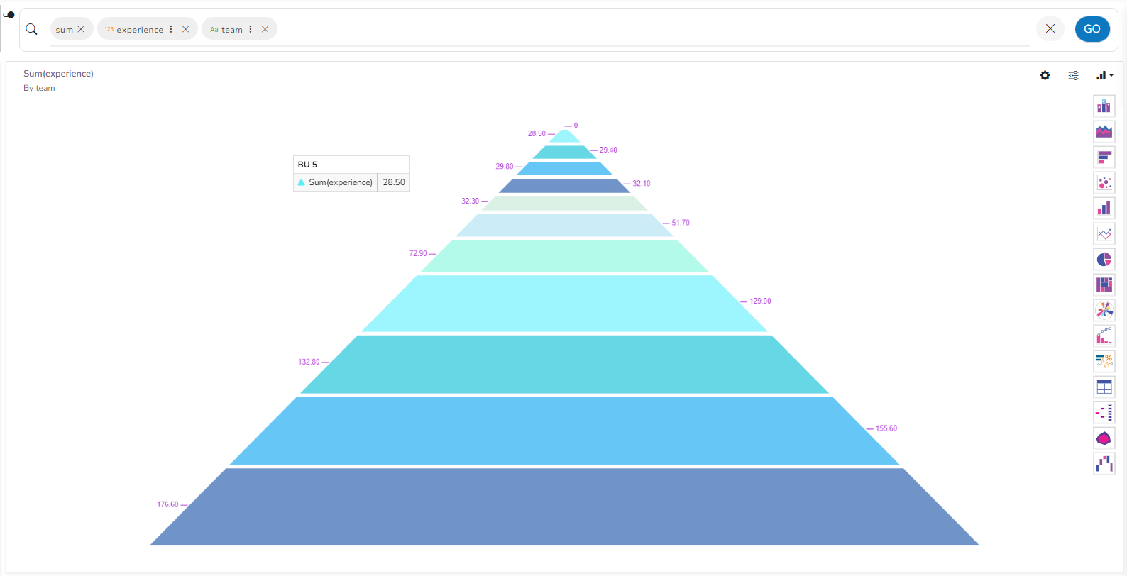 The users can invert the funnel chart to see things from a different point of view. It widens at the bottom and narrows at the top pinpointing the various phases in a classified structure. This chart can be used to see the hierarchical structure of an organization or distribution process of fund/salary/profit etc. ​