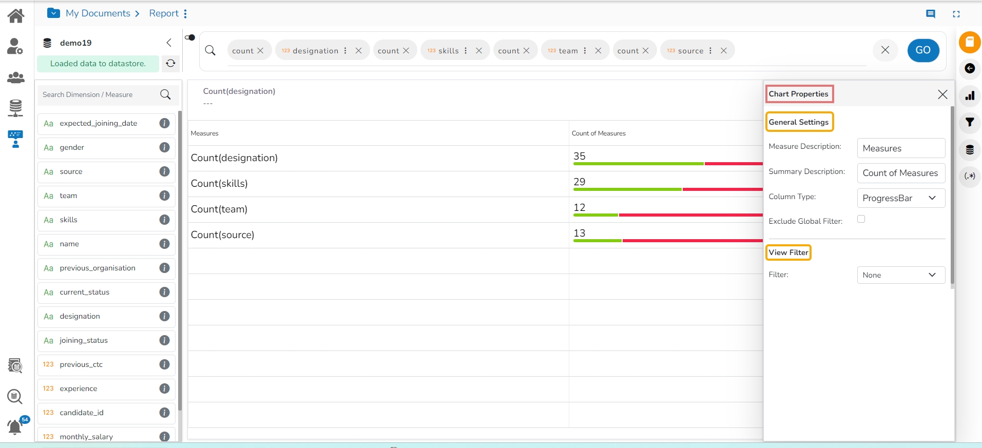 The Metric Summary displays the measure-wise summary. The users can select any number of Dimensions and Measures to show the metric summary.