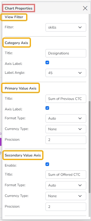 The Series Properties need to be configured to avail the description and modified display of the Secondary Value Axis. It also helps the user to modify various aspects of the primary value axis as well.