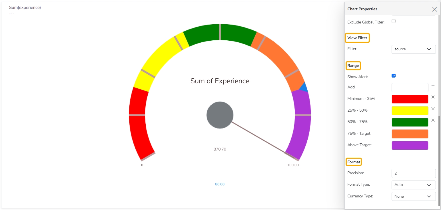 Semi-Gauge charts contain a semi-circle with the needle pointing at the target value. They indicate a specific dataset by utilizing a semi-circle that changes color to indicate whether the monitored data is within the defined limits. Users need to set boundaries (minimum and maximum values) for the gauge scale and various colors to indicate the predetermined ranges. The ‘Show Alert’ option has been provided to indicate the situation when the target values cross the set limits. Gauges are used in dashboards, real-time monitors, and reports. They can display Key Performance Indicators (KPIs), progress indicators, and quantity indicators.