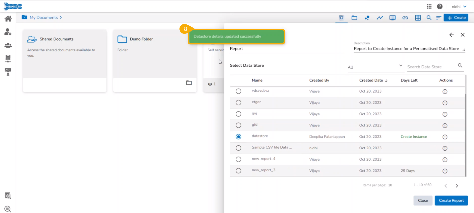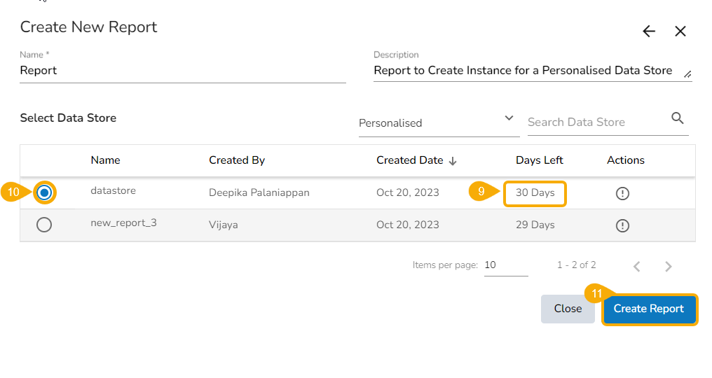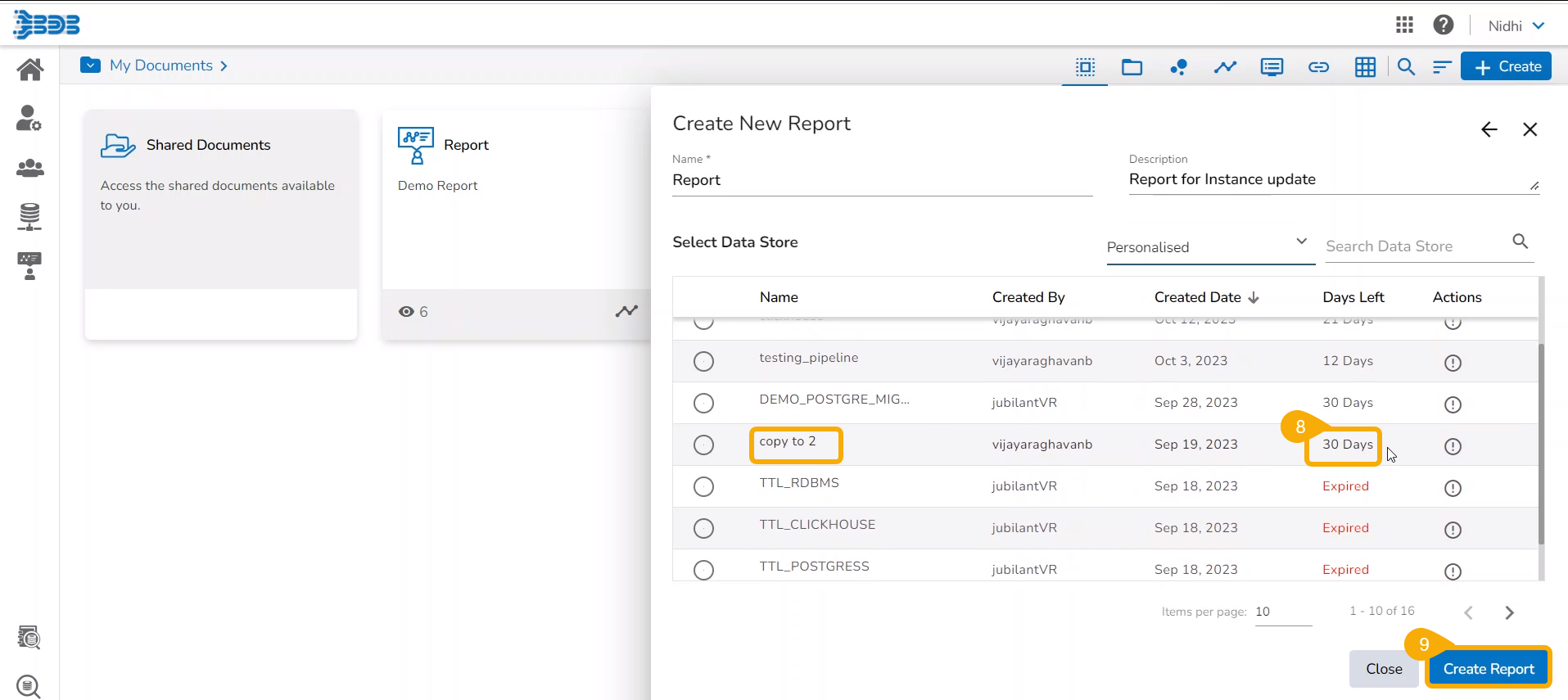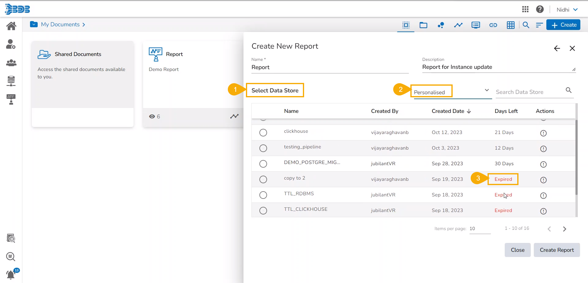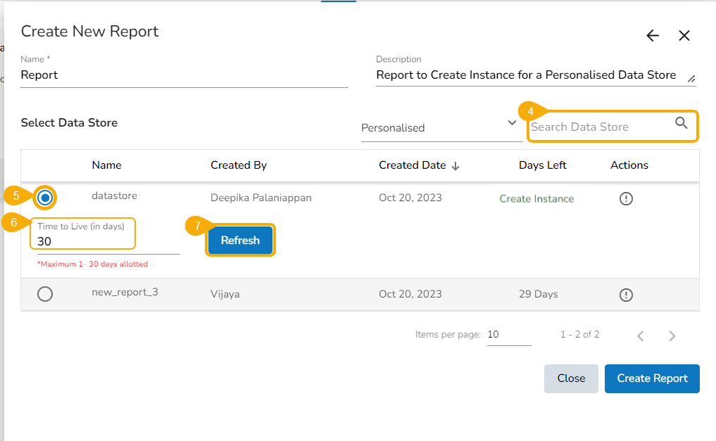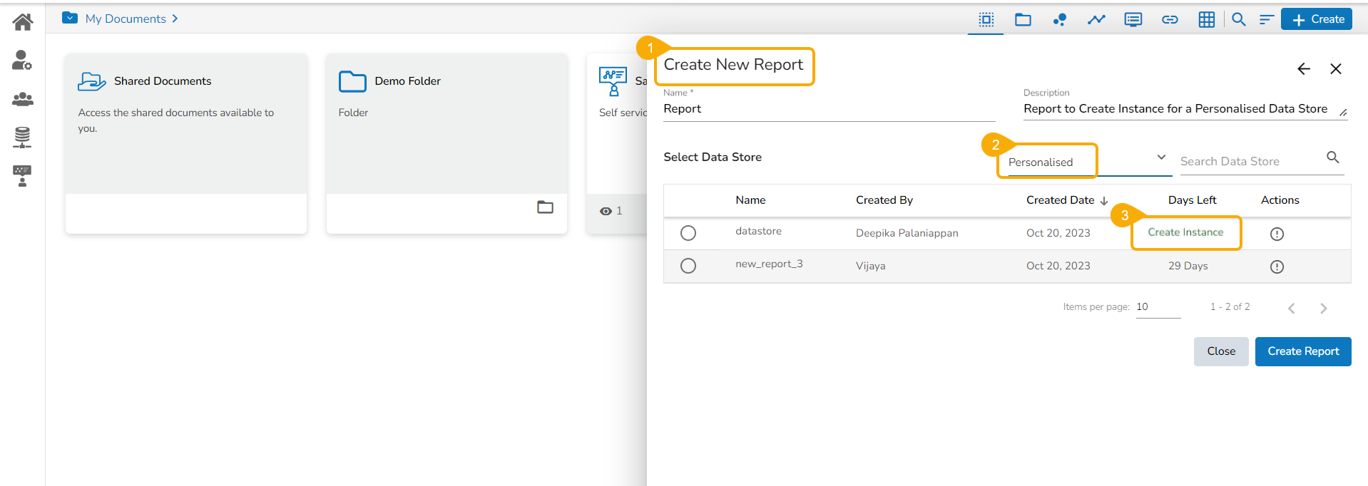 Prerequisite: Please make sure that the Data Store Settings has been configured from the Admin module to access the Instance functionality for the Data Store inside a Report.