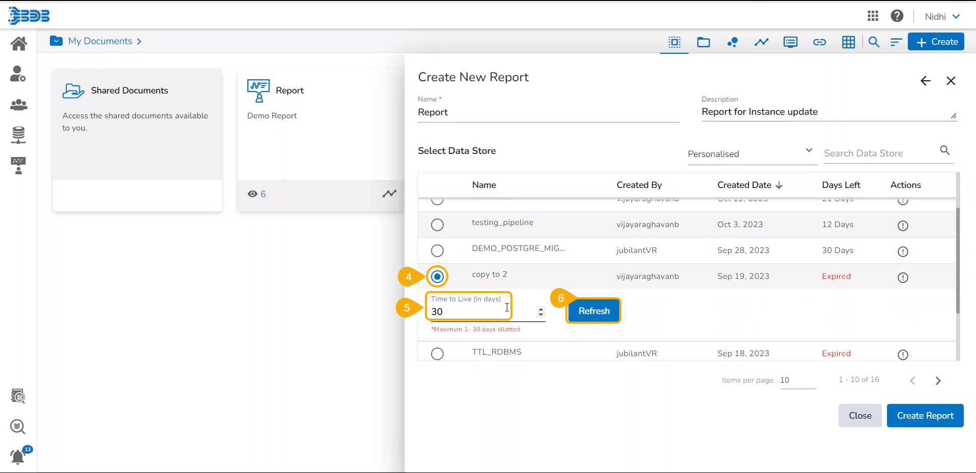 Click the Data Store to open the Time To Live (in days) option. Provide the no. of days for the selected Data Store to create new instance.