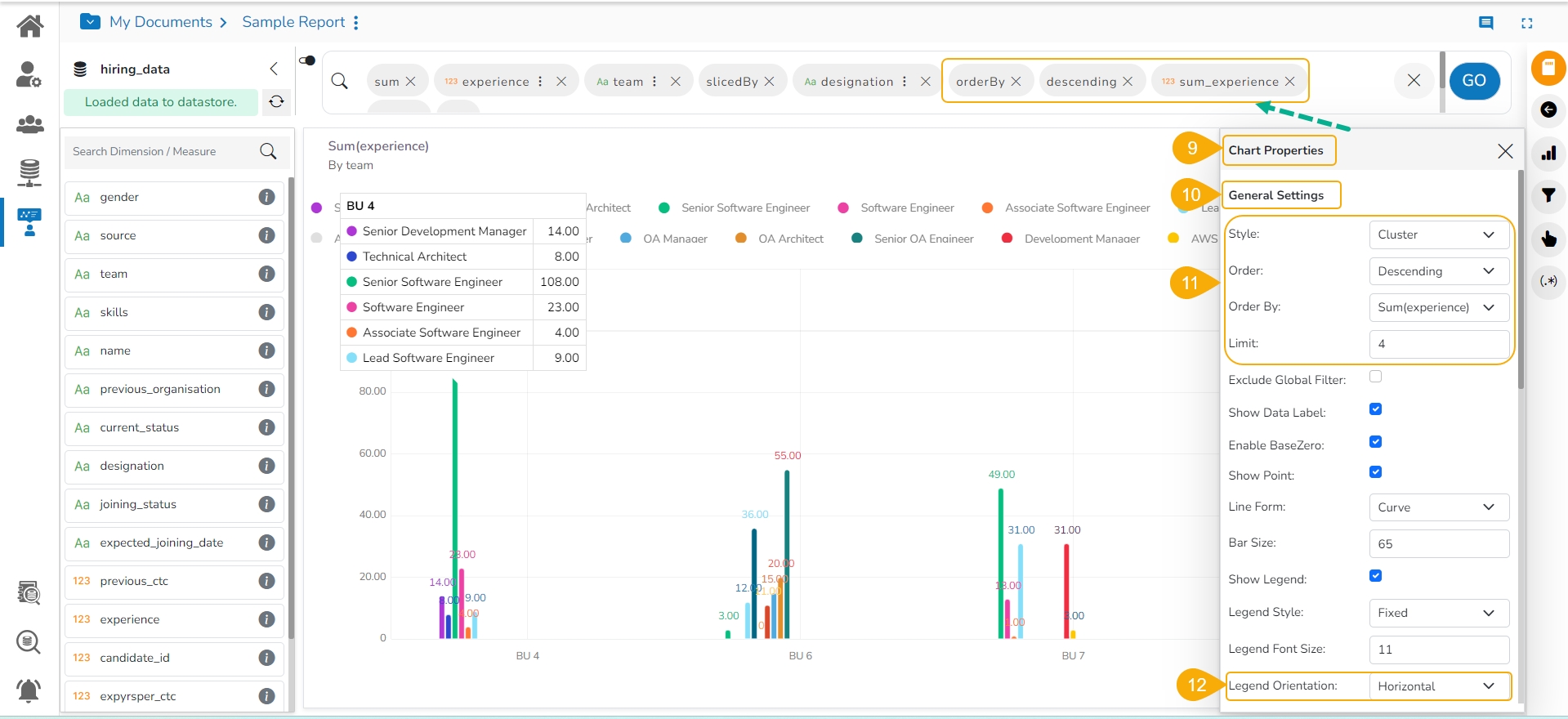 Drag and drop one dimension and one measure to the Dimensions/ Measures column using the Design canvas.