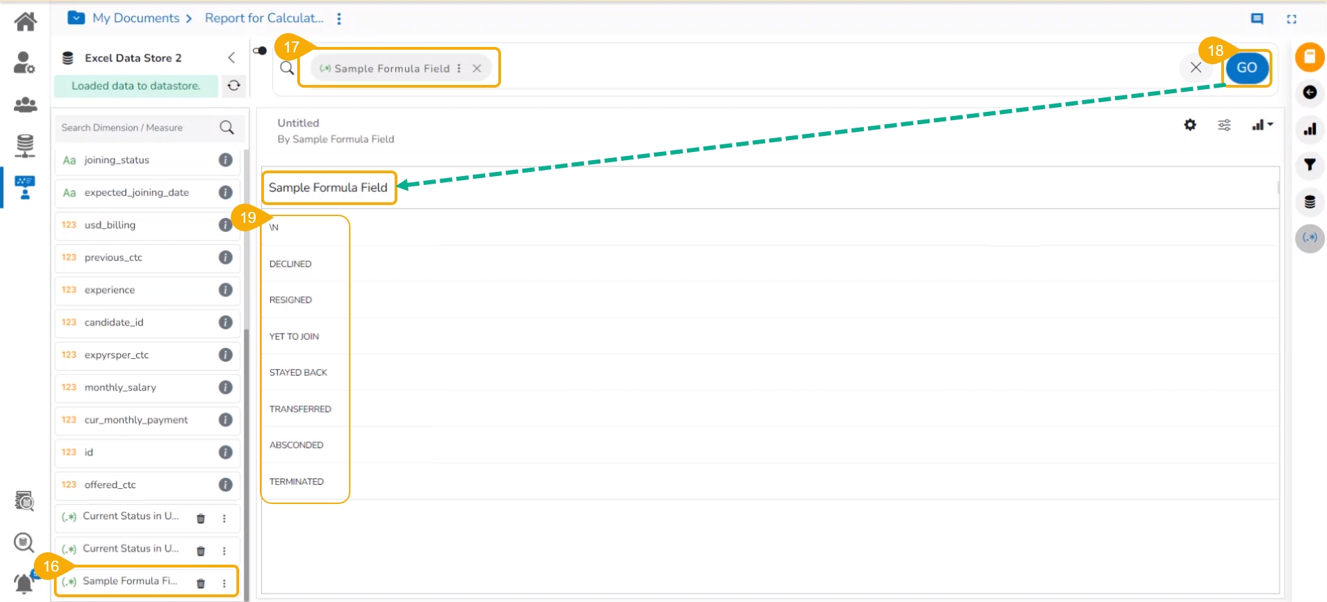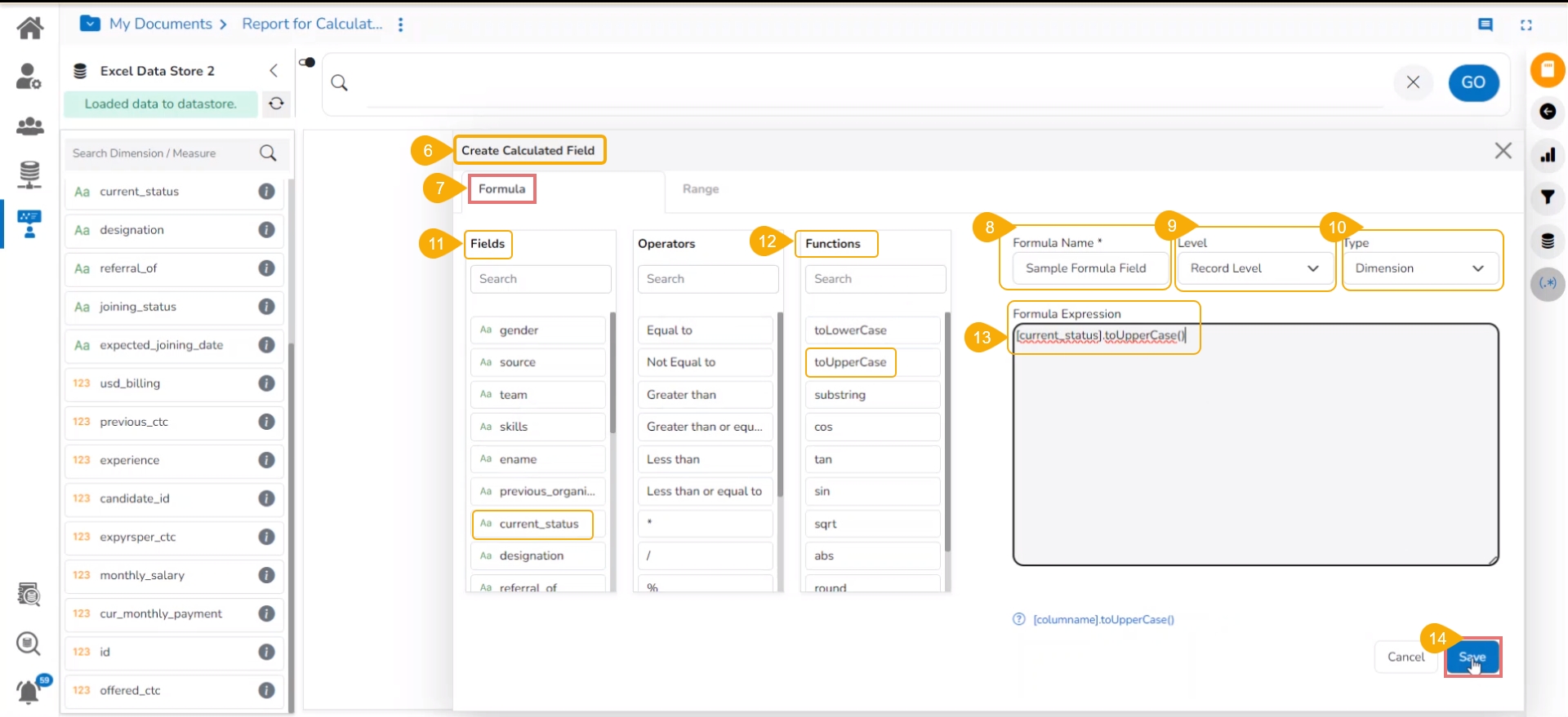 Formula Expression: Based on the selected combination of Fields with Operators or Functions the Formula Expression gets entered in this space.