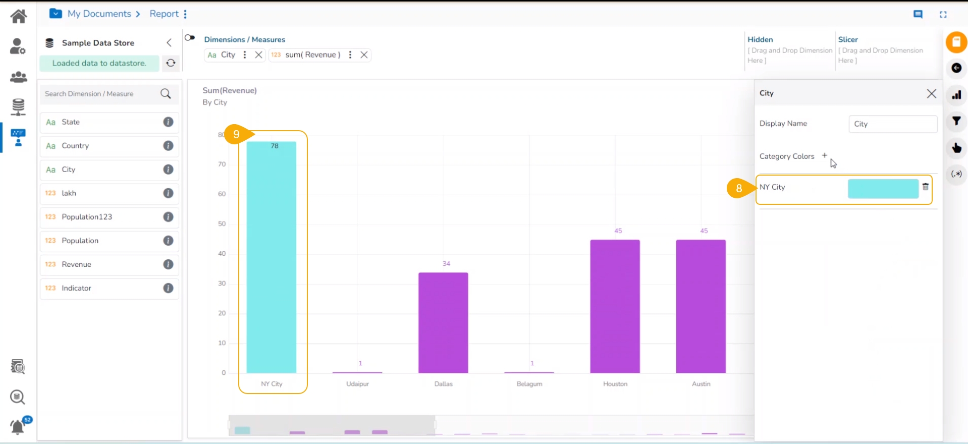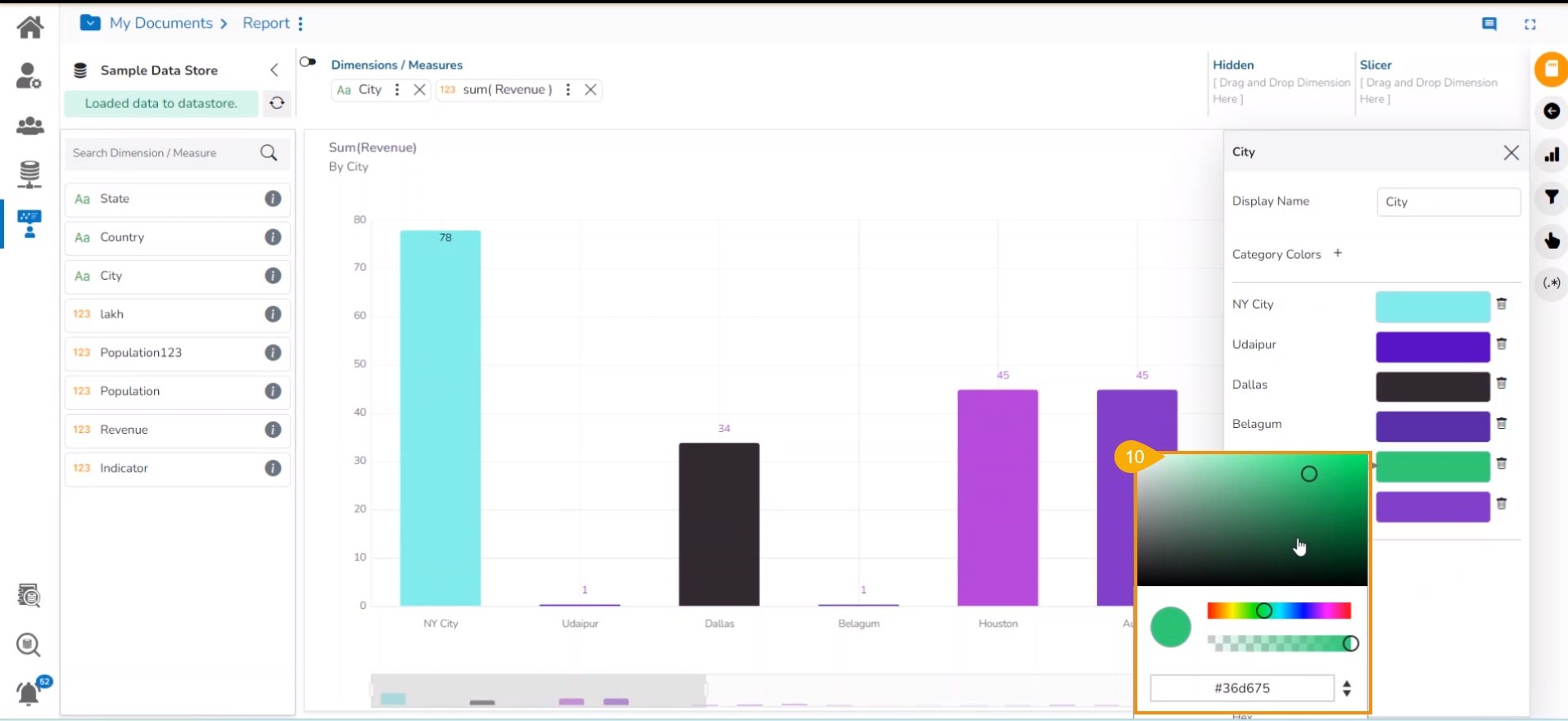 The users can customize a category color and apply it to a specific category using the Category Colors window. The users can assign specific colors to different categories within their data, facilitating easier identification and differentiation of data points or groups while designing a View.