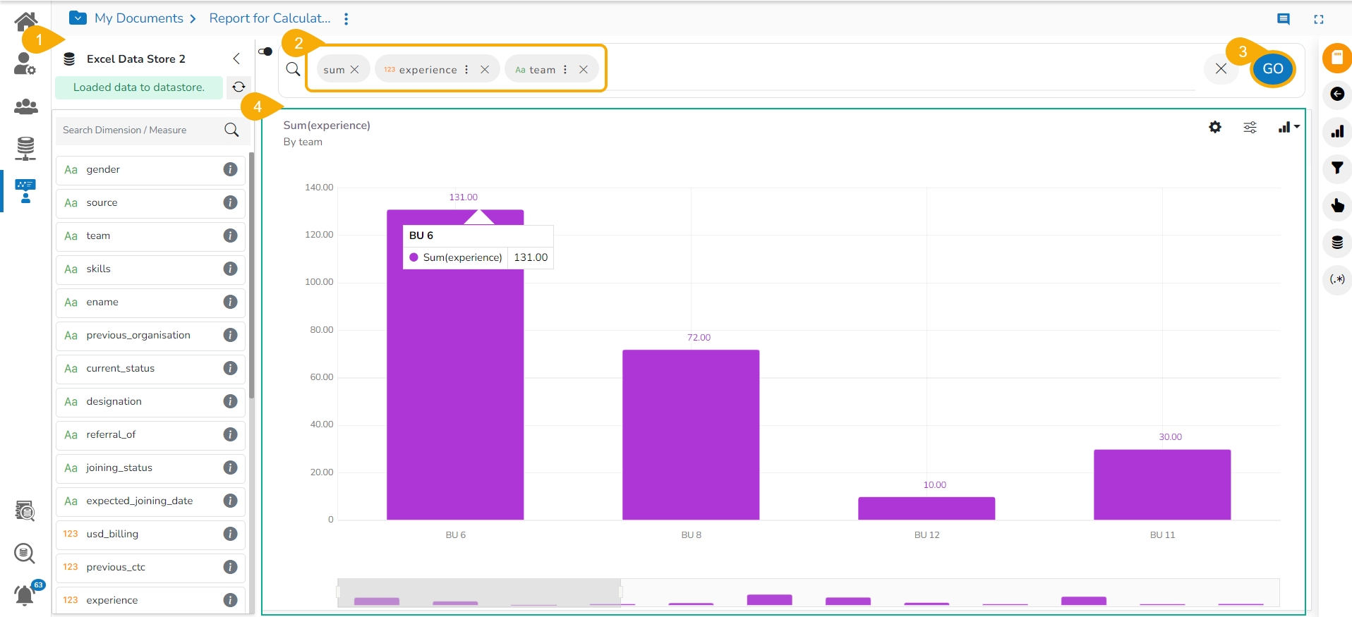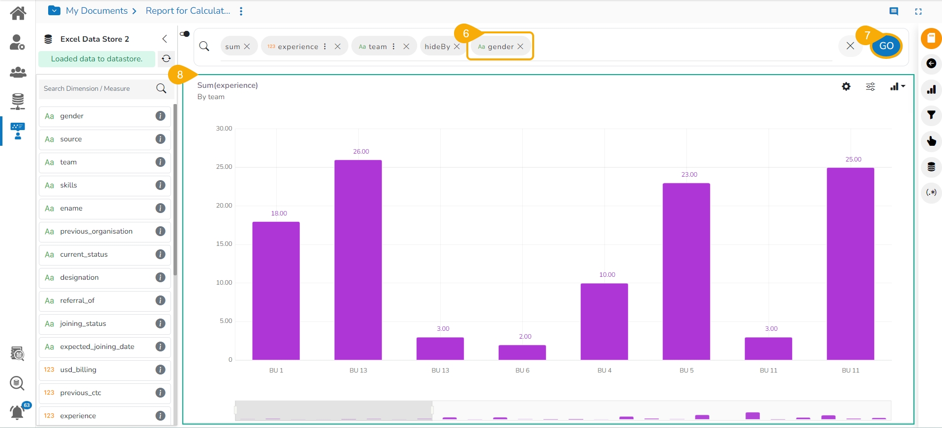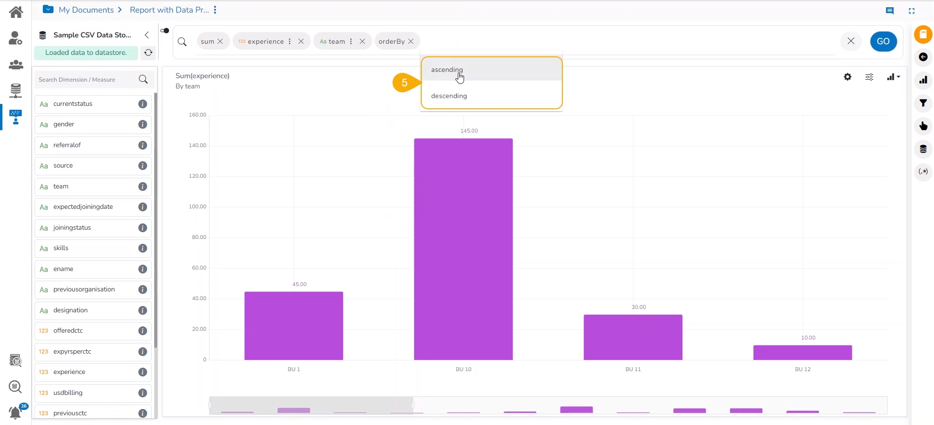 The View gets filtered with the provided order by and limit configurations. E.g., the following View displays 6 records of Sum of experience by Teams in the Ascending manner.