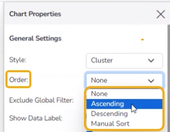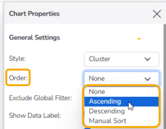 Order By: Select an option from the drop-down list to set the order of the view (the dragged dimension and measure display in the Order By drop-down list)