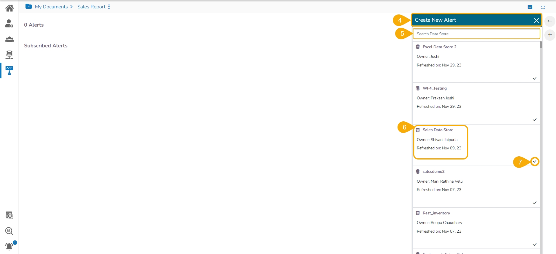The Alert window opens, displaying a list of the available Data Stores.