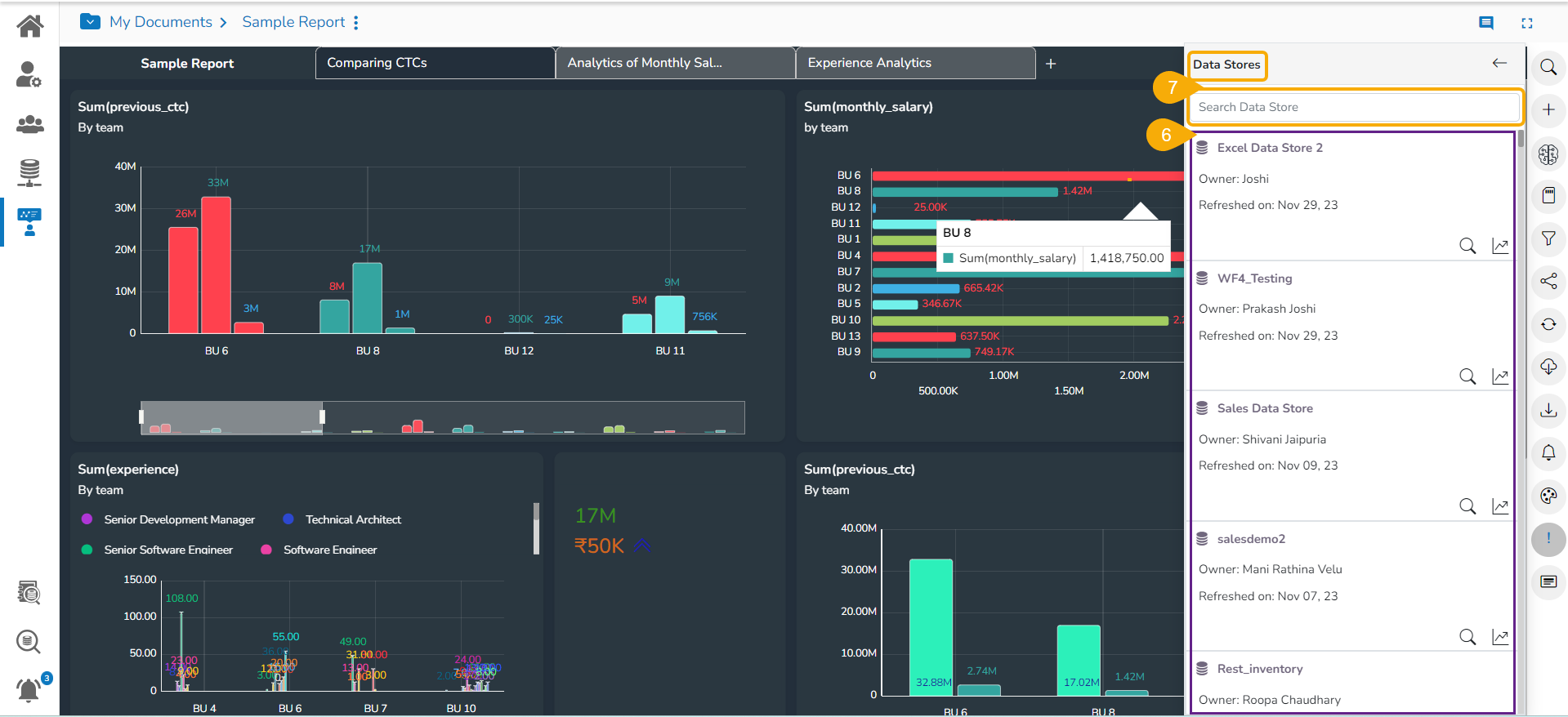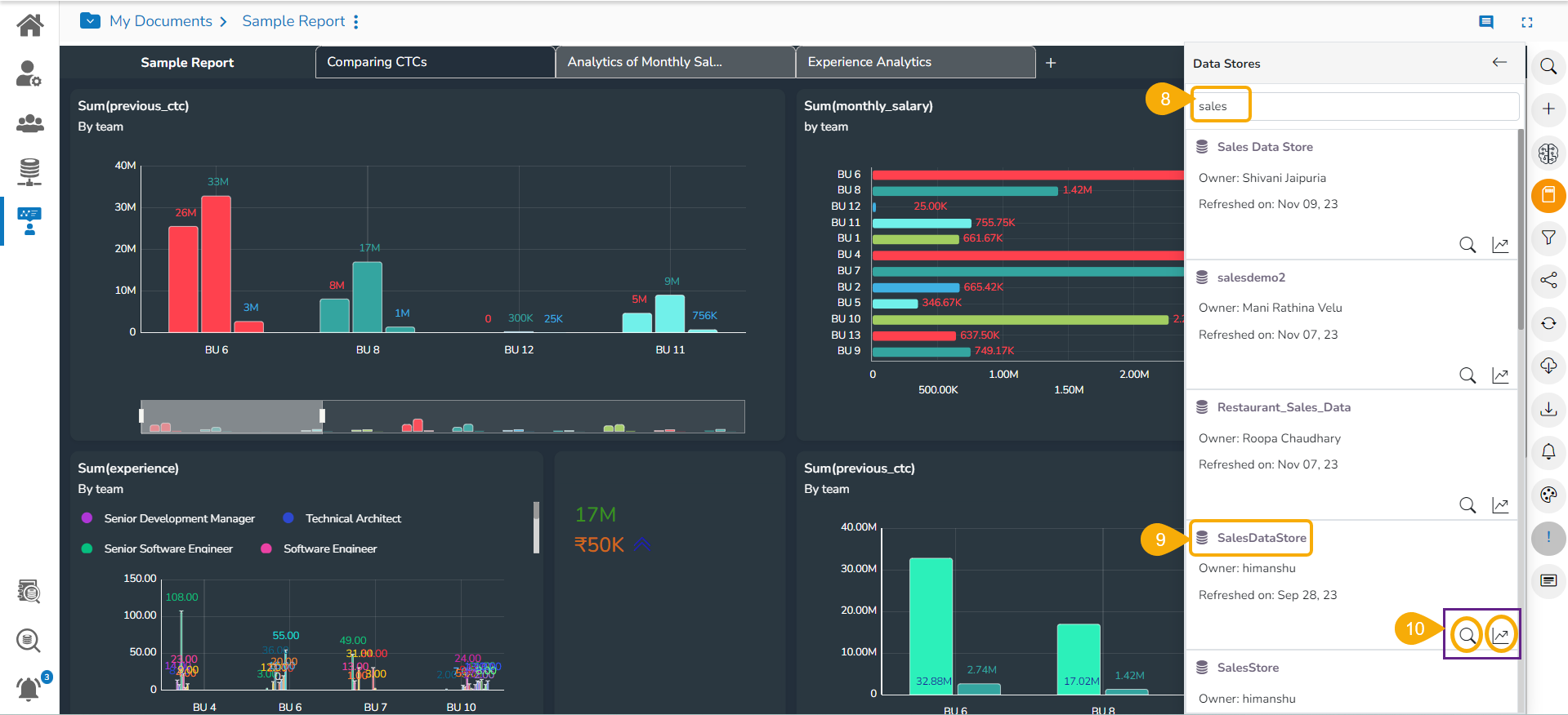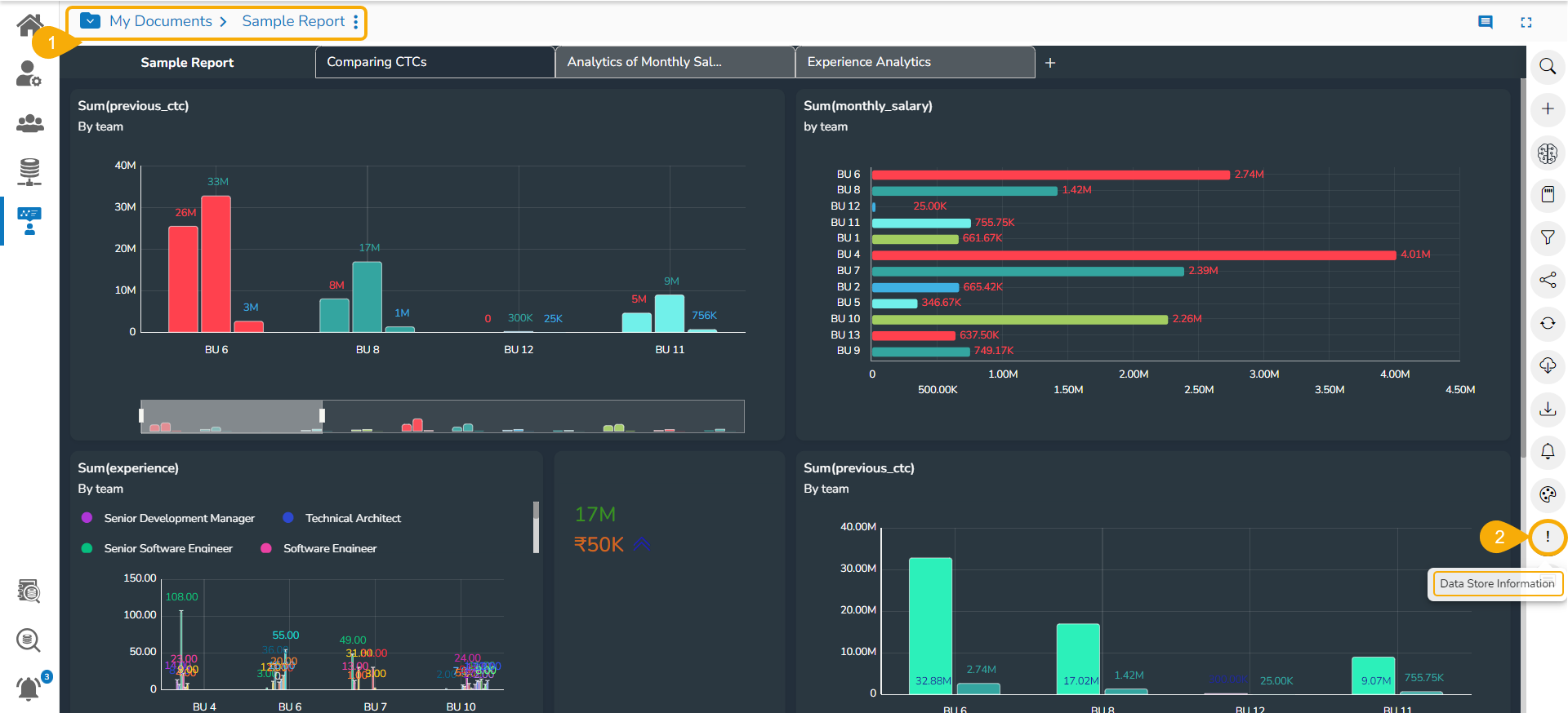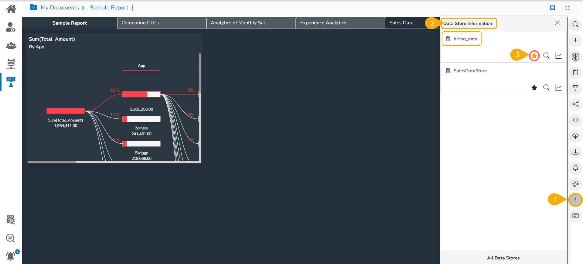 The data store information icon helps the user to manage data stores in a report. This icon is accessible from the final screen of the report. By clicking the Data Store Information icon, a new page opens, and the users get some more options to be used on a data store.