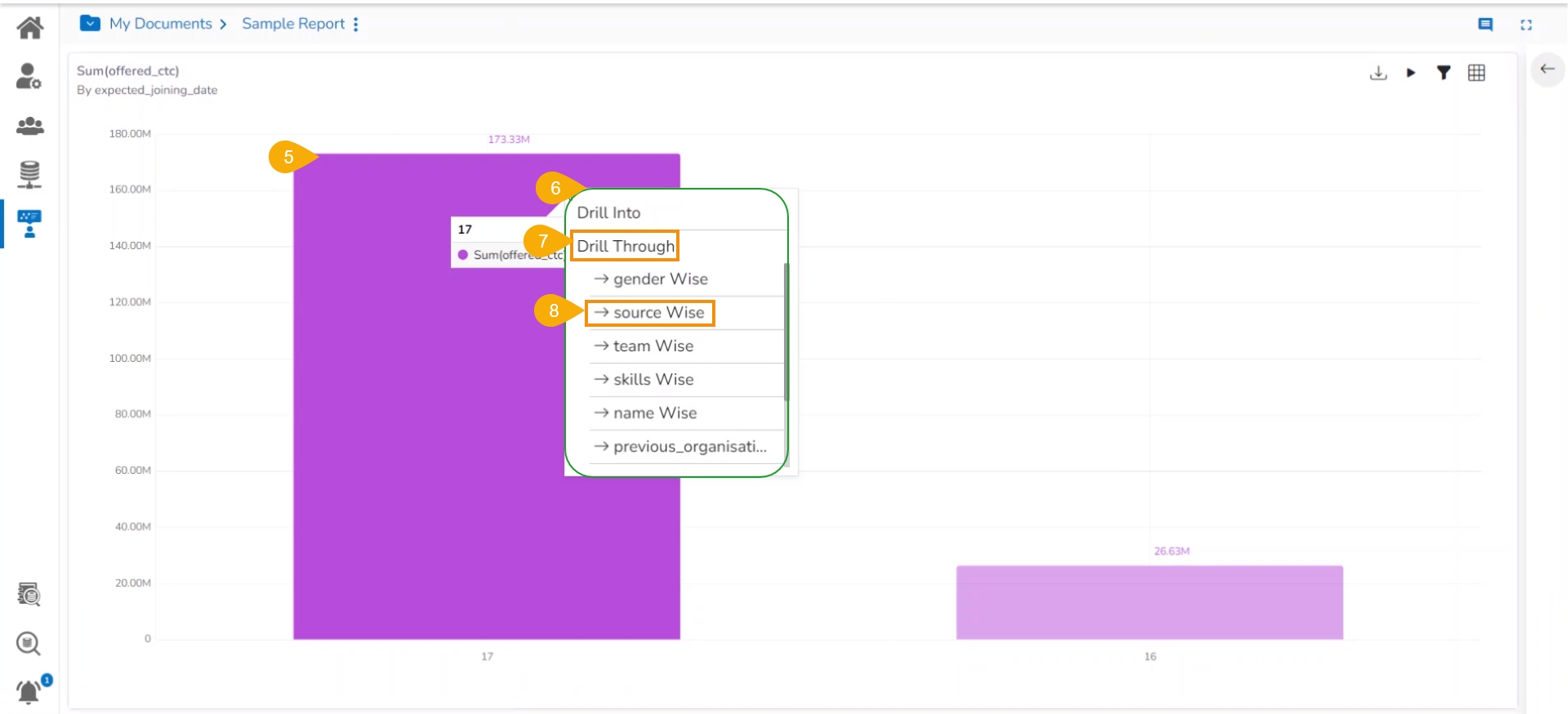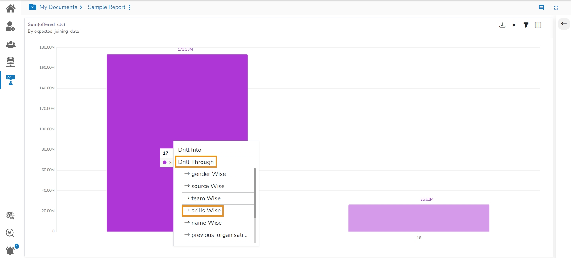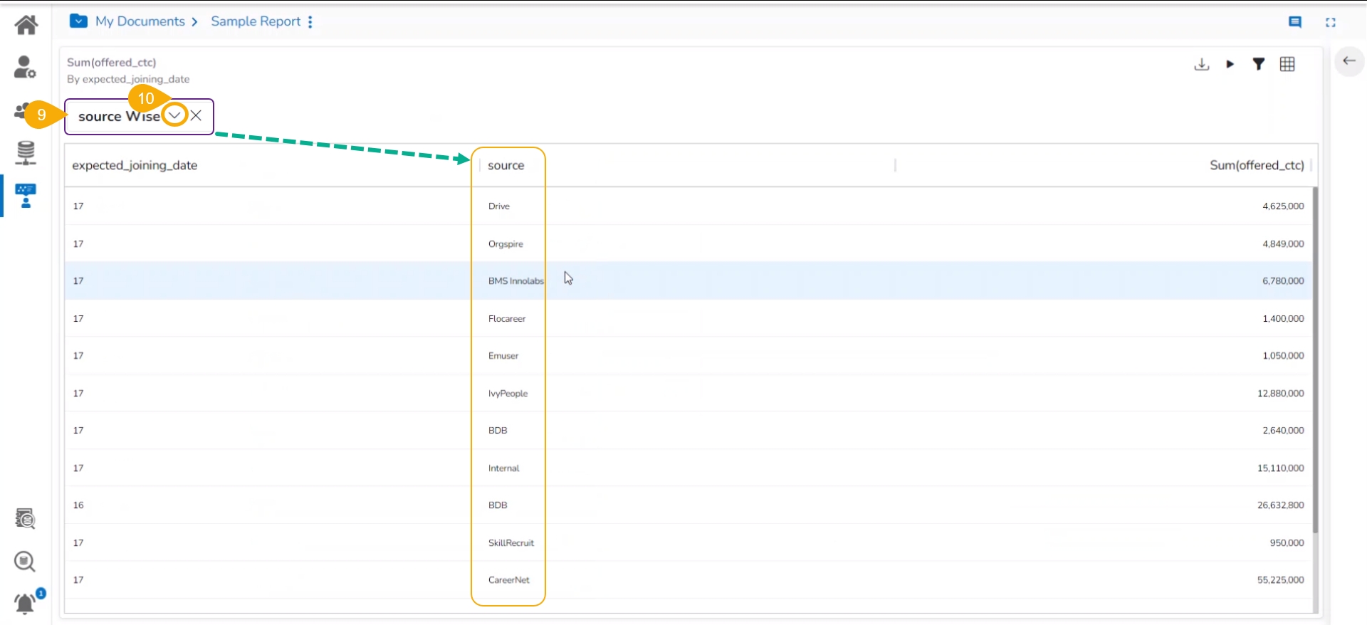 The View gets modified based on the selected drill through option (E.g., the source wise sum of the offered CTC is displayed via the Data Grid).