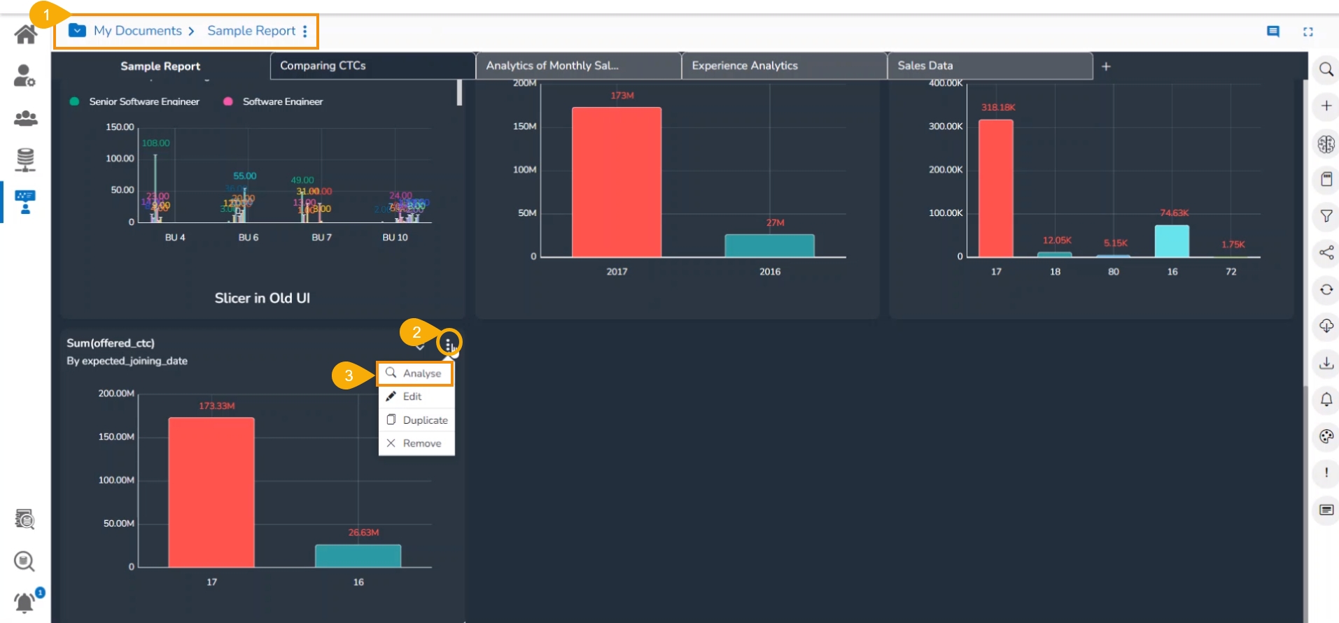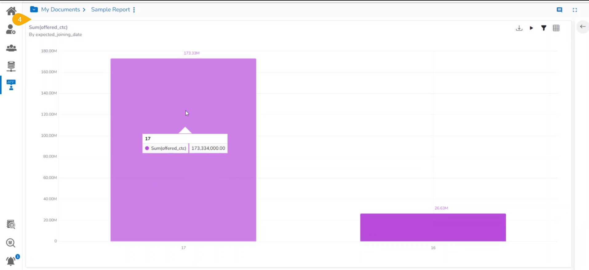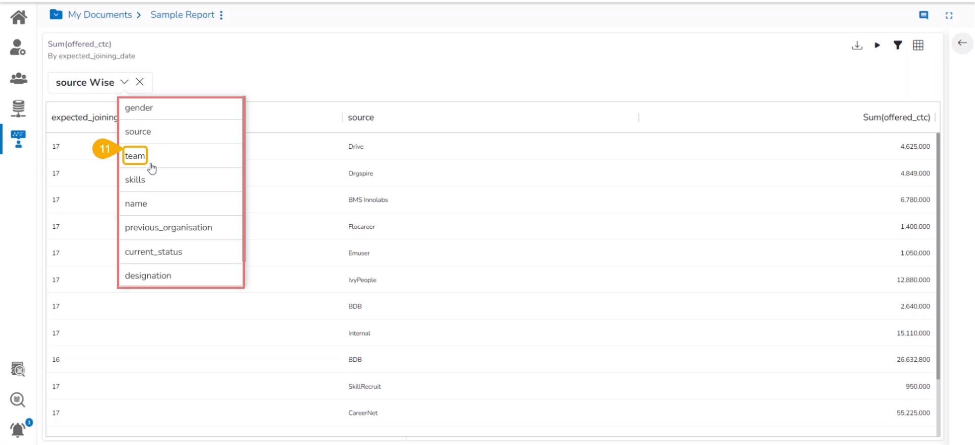 The View gets modified based on the selected drill through option (E.g., the source wise sum of the offered CTC is displayed via the Data Grid).