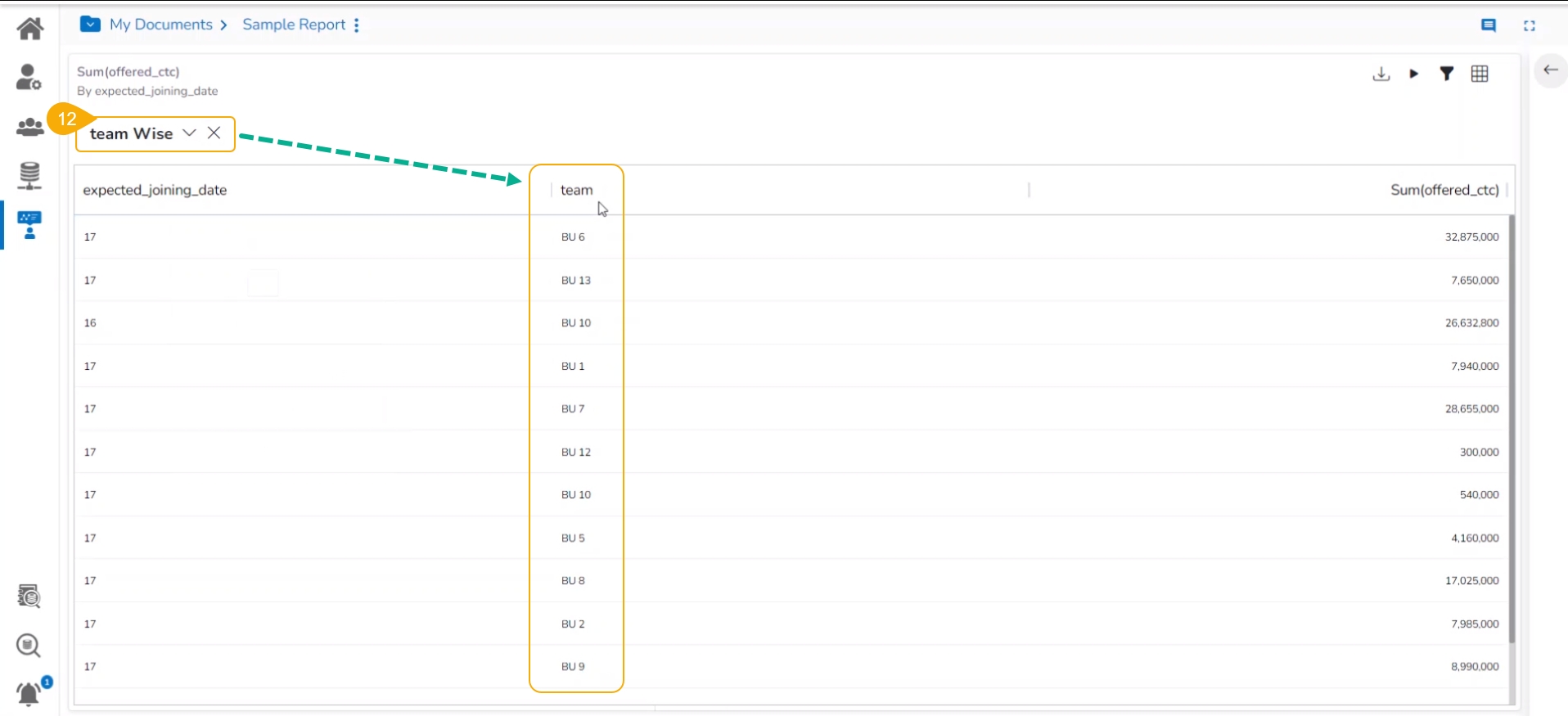 The View gets modified based on the selected Dimension. E.g., the given image displays team wise data for the selected View.