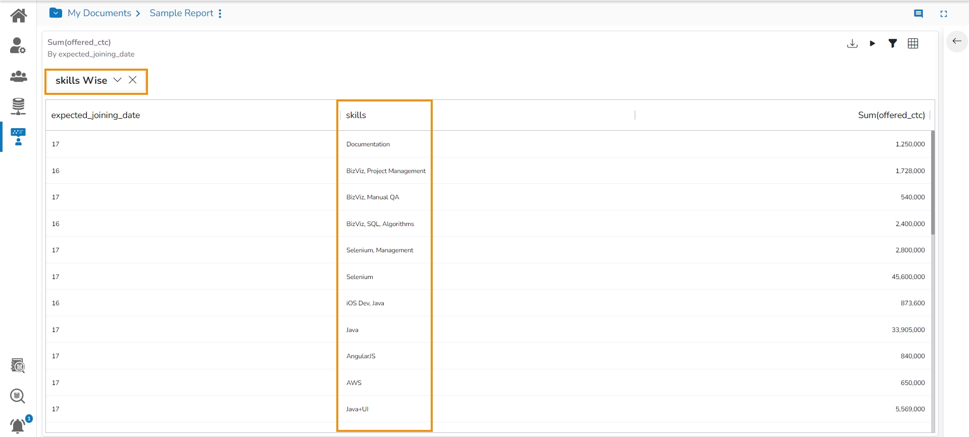 The customised data as per the another selected drill-through Dimension option gets displayed. E.g., the following image displays the Skill wise data for the selected View.
