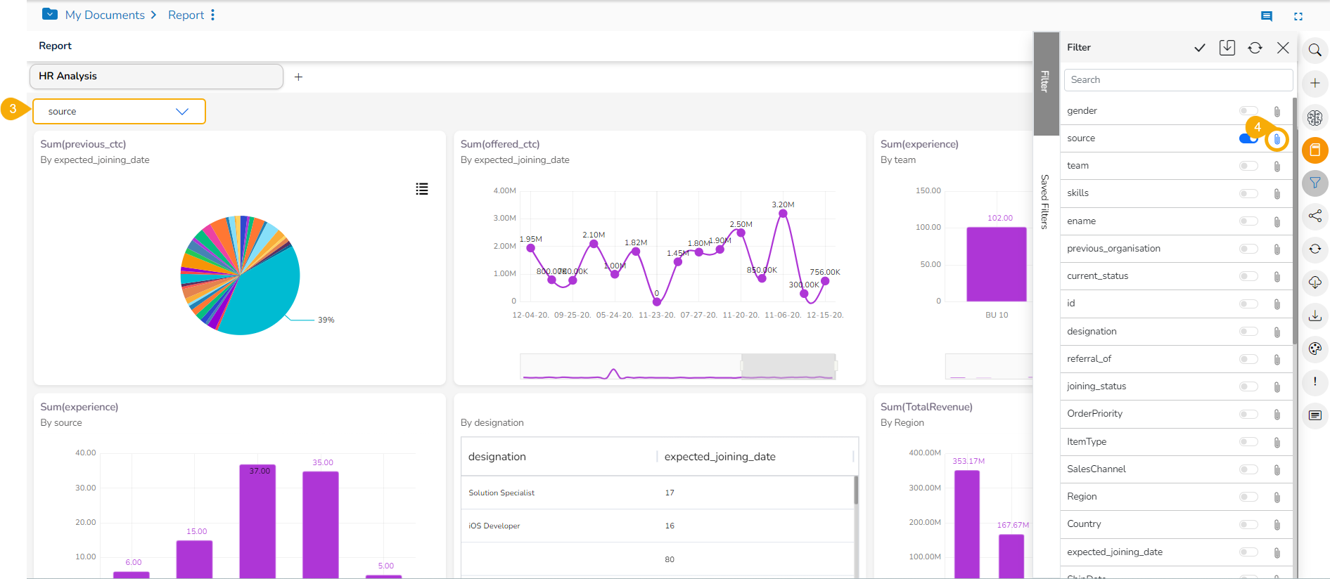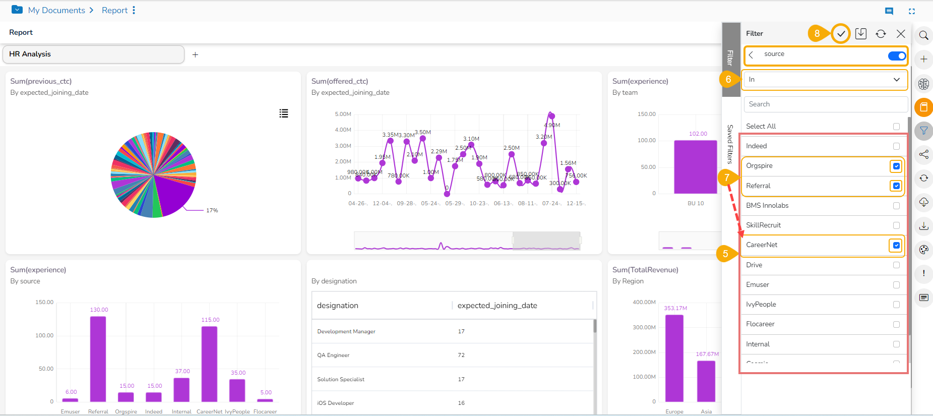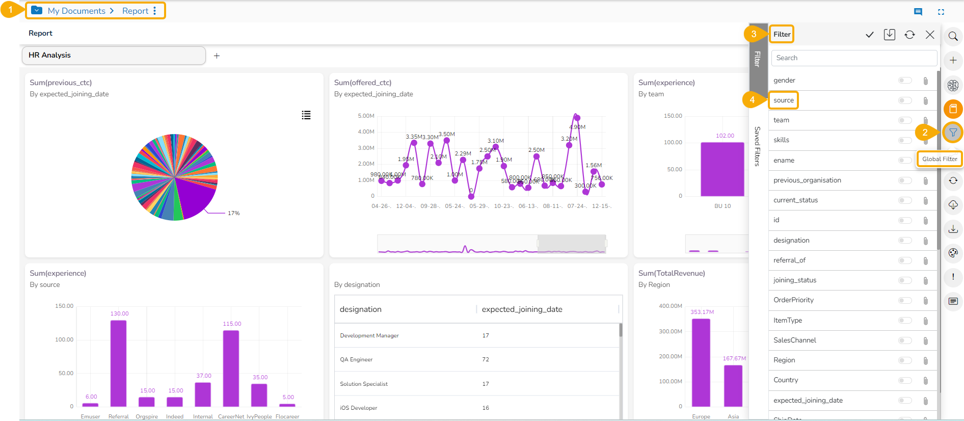 The Global Filter is applied sequentially based on user selections. For example, if the first filter is by Source (Referral, Orgspire, CareerNet) and the second by Gender (Female), the report will display data for female employees from these specific sources.