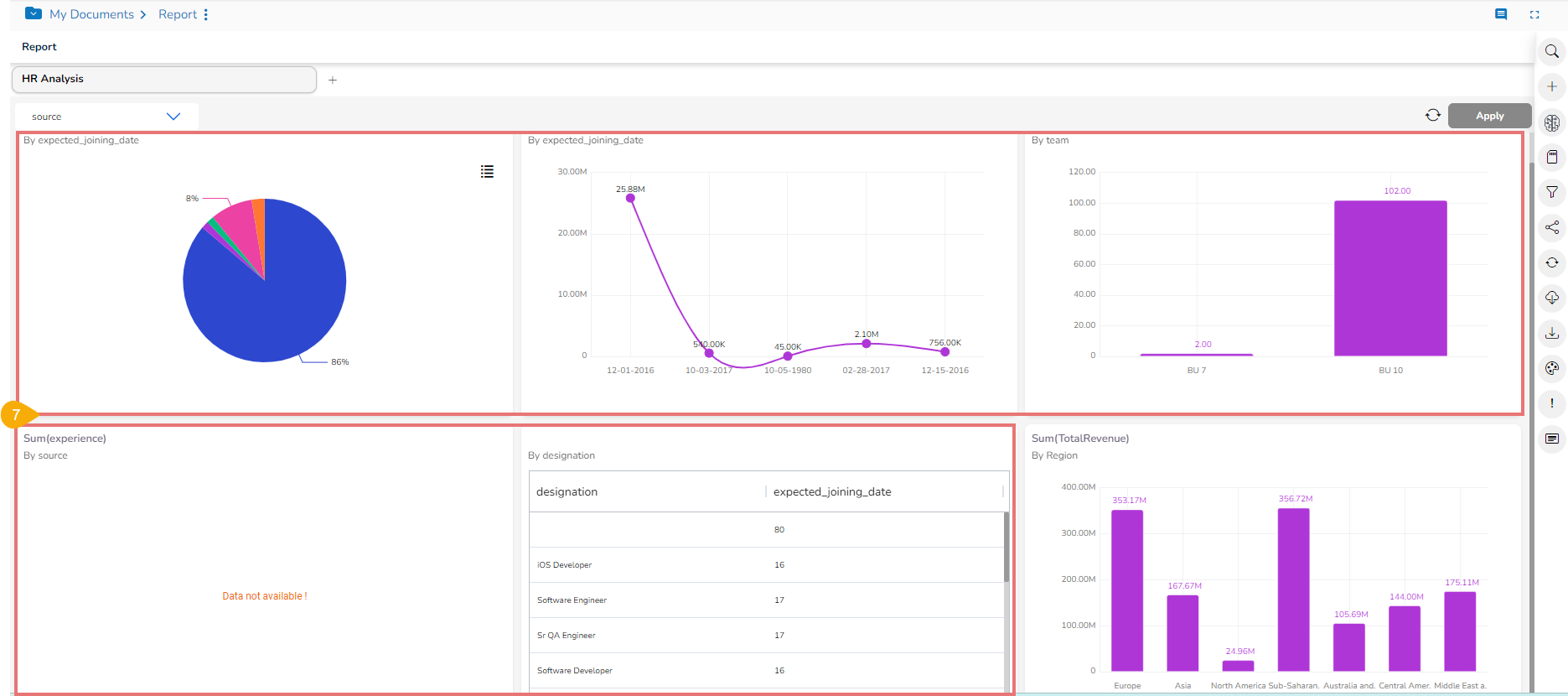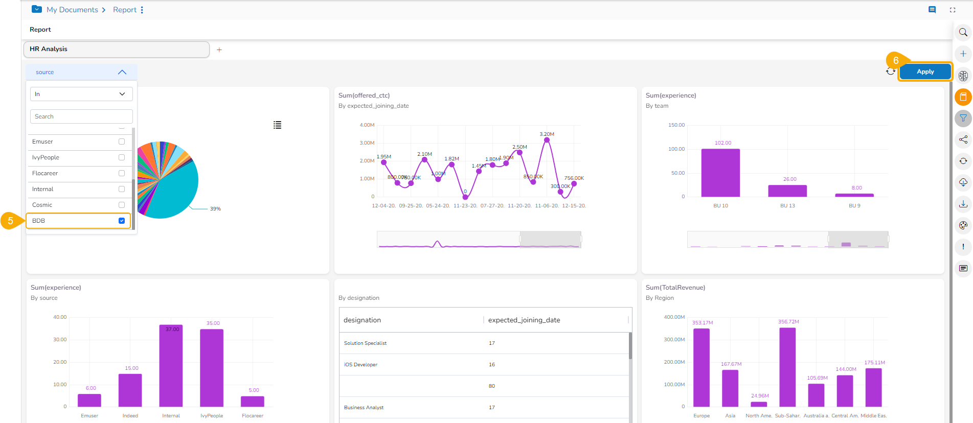 The concerned Views of the selected report get customized as per the applied Global Filter condition. E.g., All the concerned Views are filtered by the selected Global filter value in a report. In this report, the first Five Views are modified, and Six View is excluded from the Global Filter as it is based on a different Data Store.