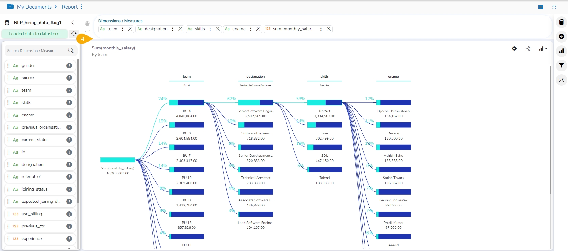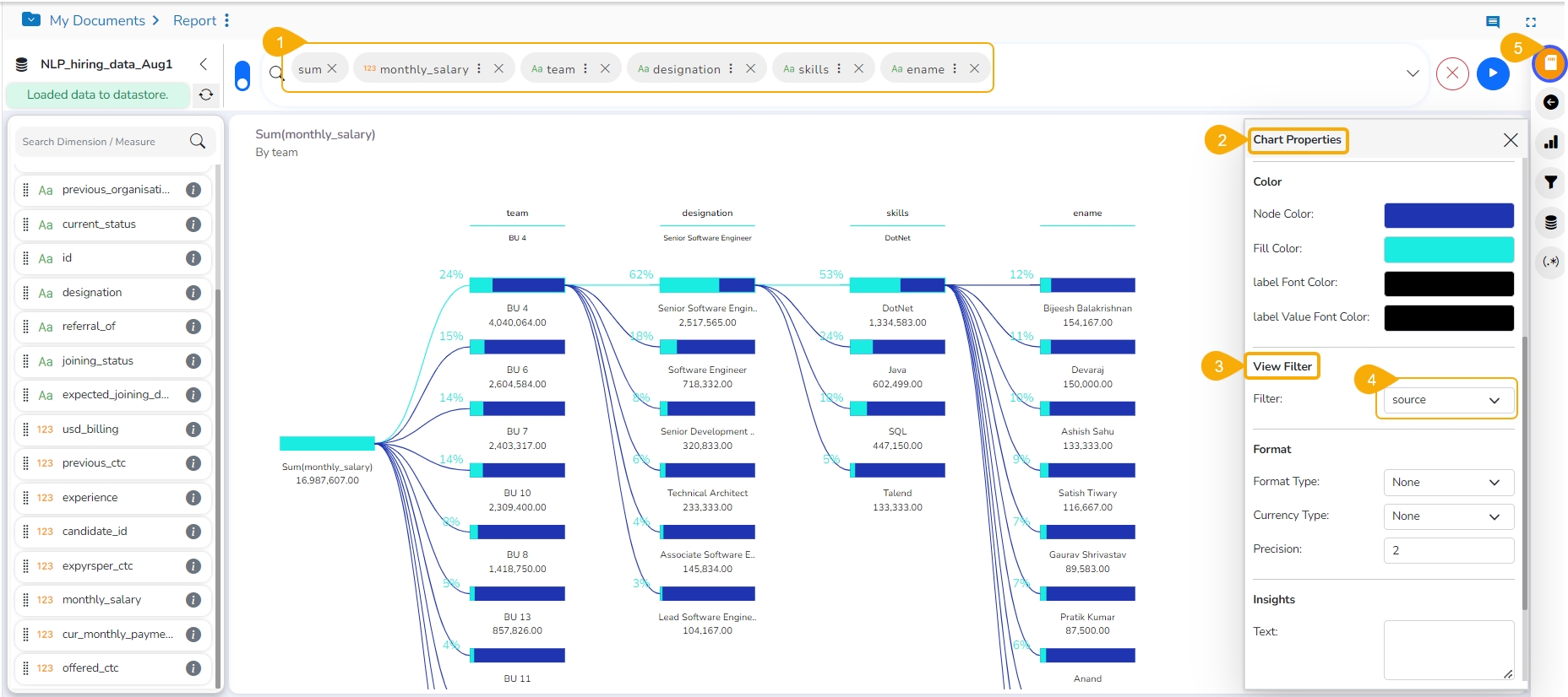 Create a View by the drag and drop of the desired dimension and measure options using the Design canvas (By default, the Mixed chart gets selected to display the selected data).