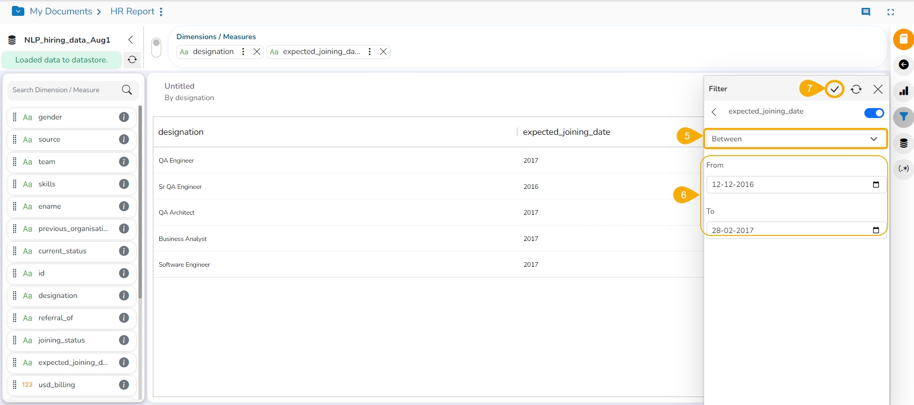 The users can apply Date based View Filter by selecting the Date Values from the Data Store. The user can provide two kinds of conditions on the Date values: