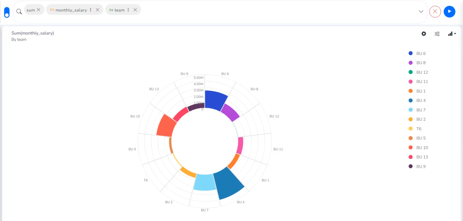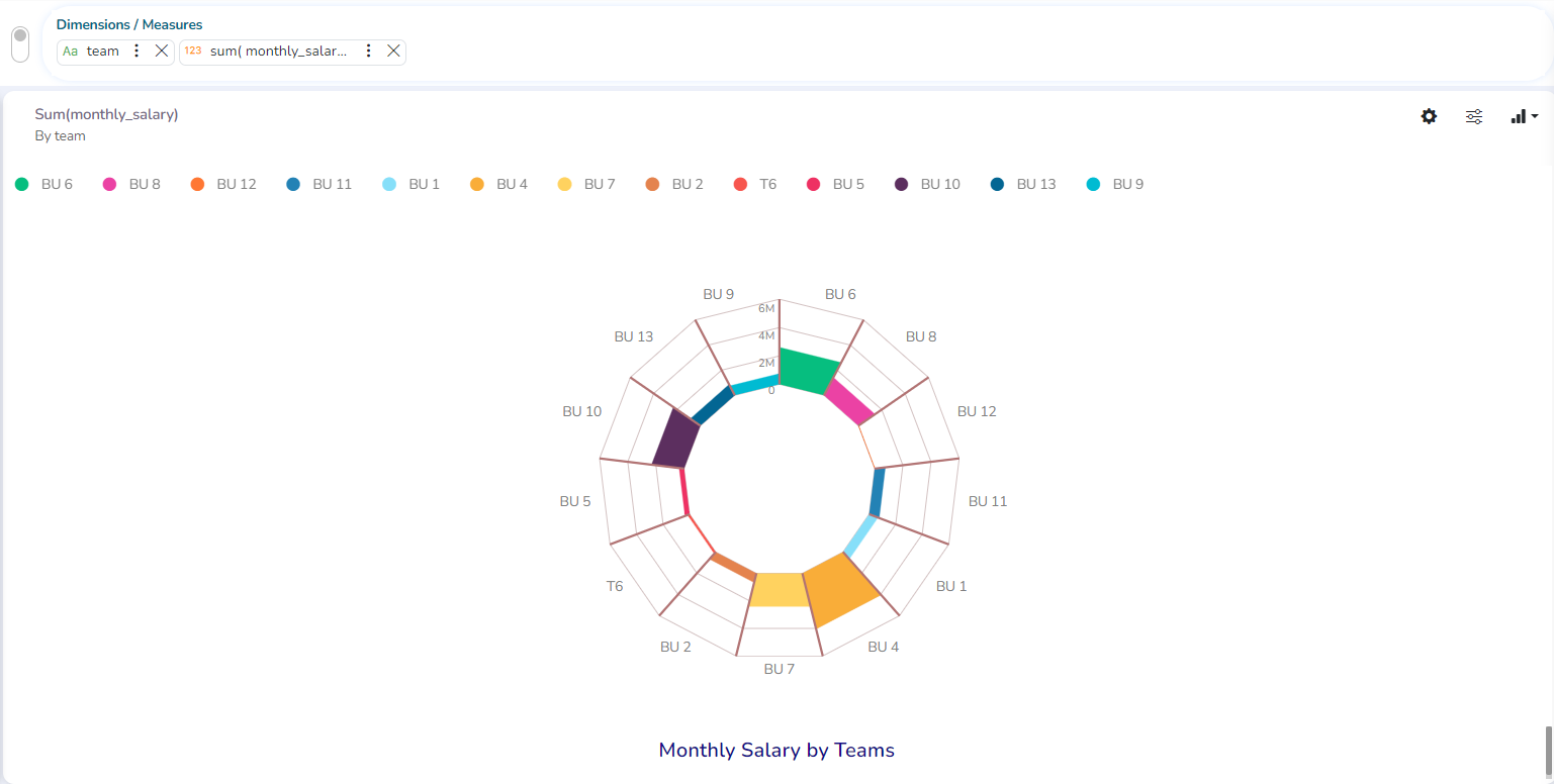 The Circumplex chart, also known as the Polar Area chart or Nightingale Rose chart, is a combination of the Bar chart and Pie chart. Each category may have more than one sub-category, where a section of the disc shows that each subcategory and each section has the same angle. The value of the corresponding sub-category is shown through the area. By changing the radius in a Circumplex chart, users can adjust the area of each segment (based on data).