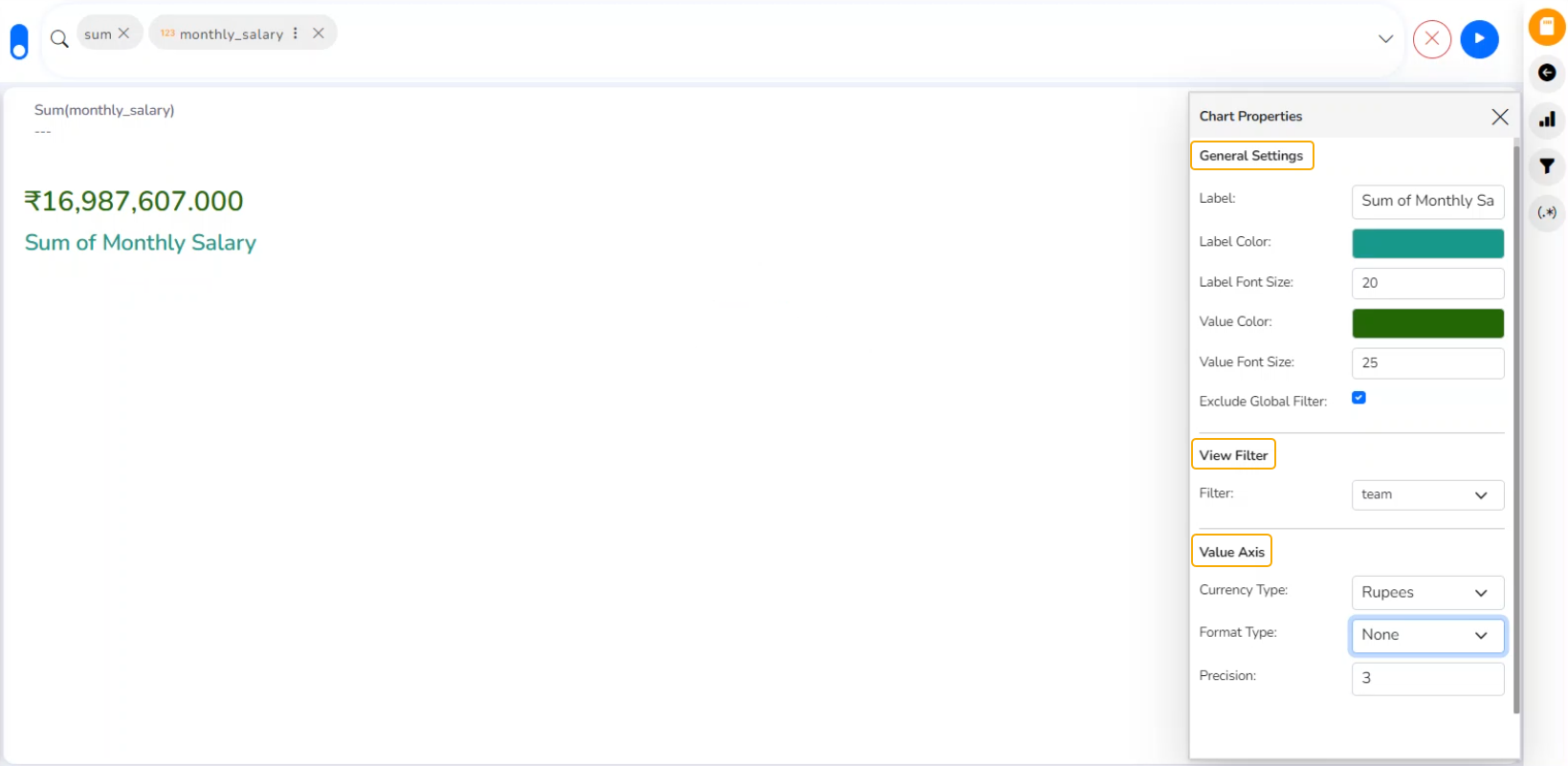 * E.g., the image displays the Sum of Monthly Salary in INR, where the selected Format is Thousand, and the Precision value is not selected.