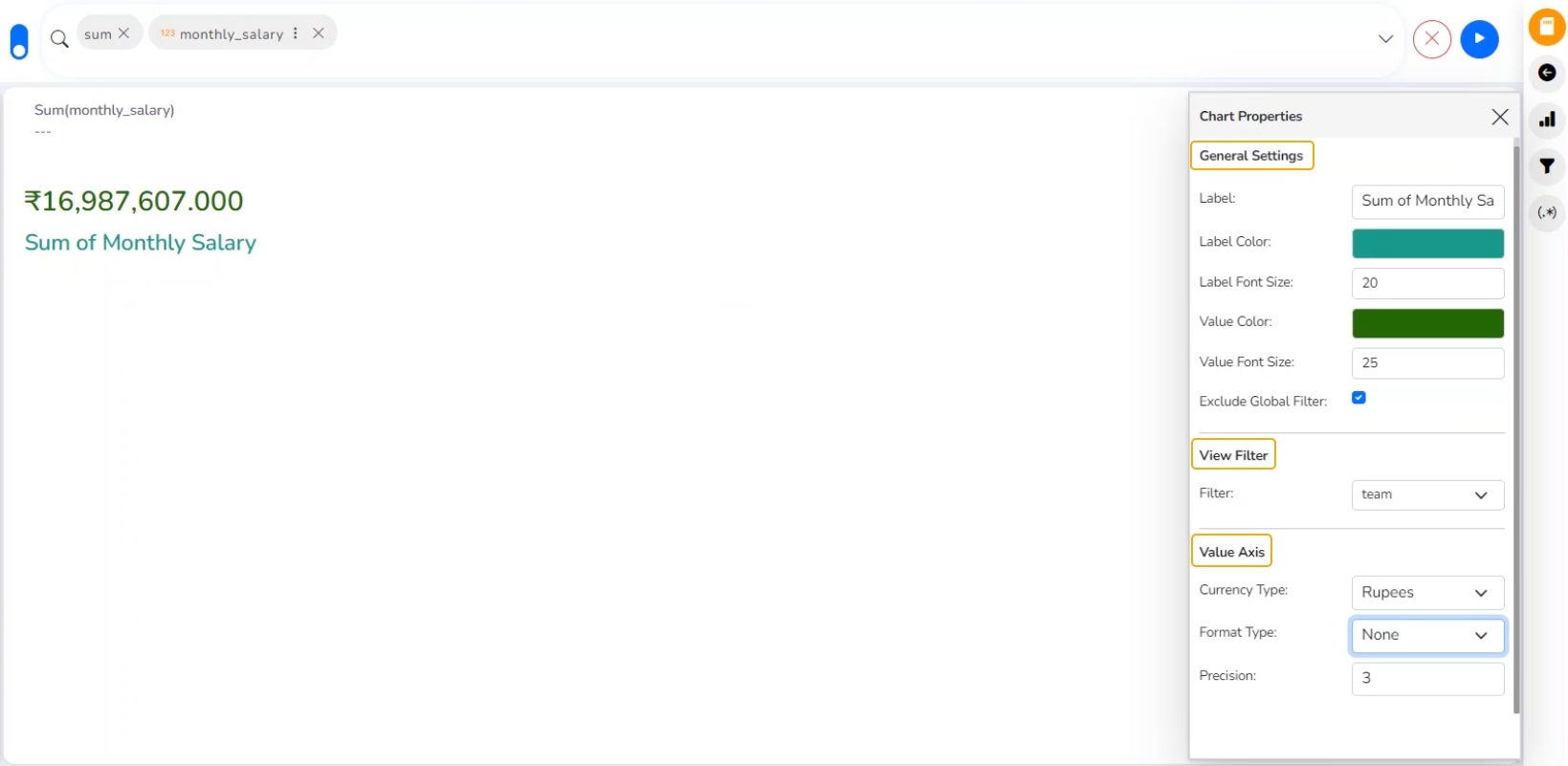 E.g., the image displays the Sum of Monthly Salary in INR, where the selected Format is Thousand, and the Precision value is not selected.