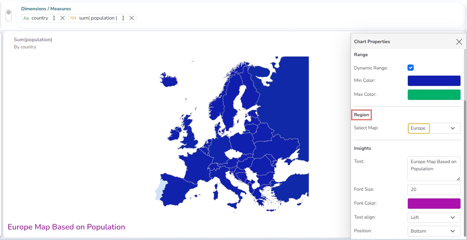 A Map chart allows the users to position their data in a geographical context using different data layers. Users can create a view based on the selected dimensions/measures representing data in the region. The designated area gets colored based on the data. Users have the provisions for changing the visualization.