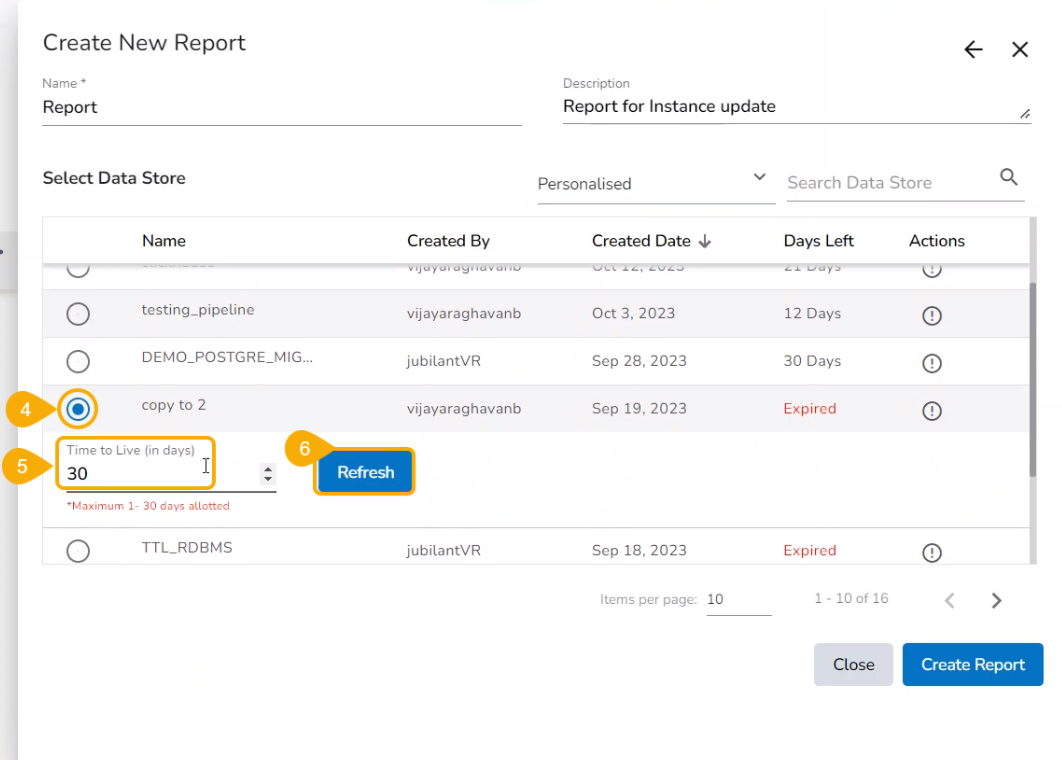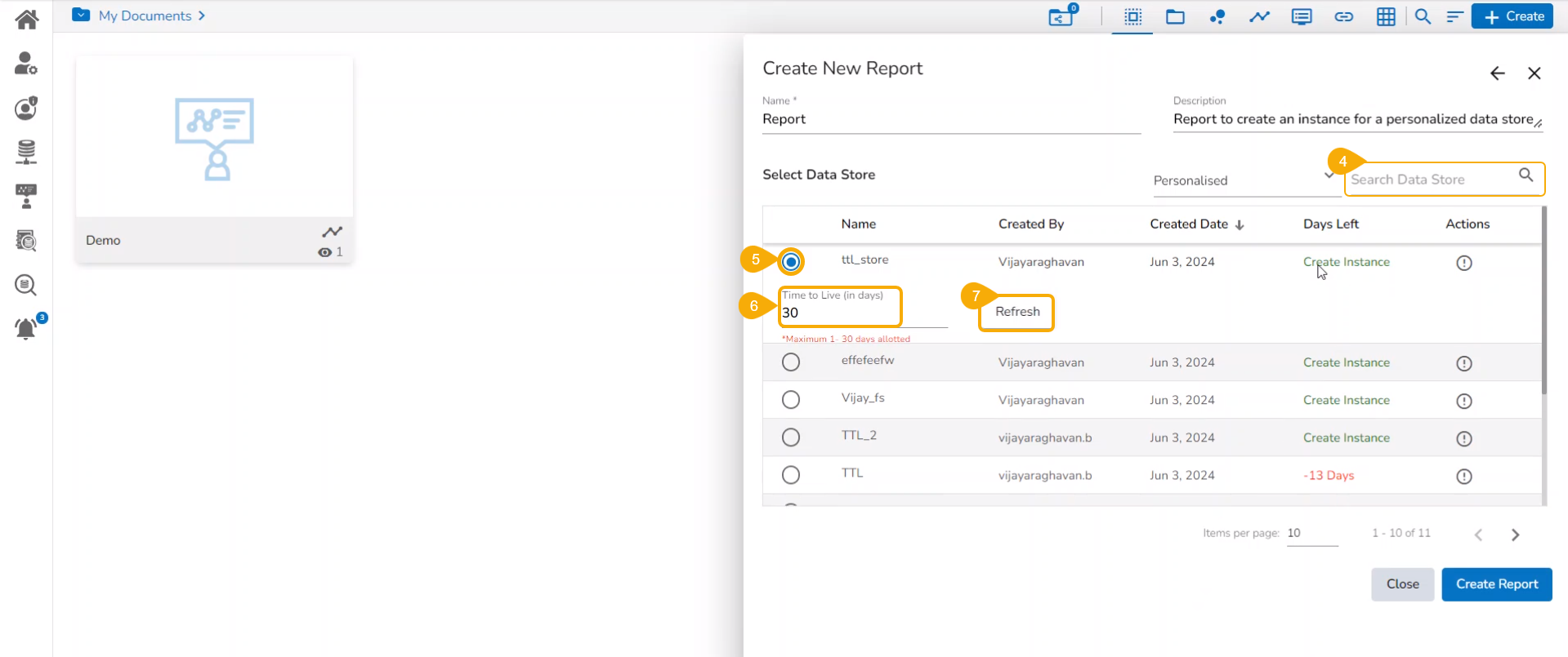 Click the Data Store to open the Time To Live (in days) option. Provide the no. of days for the selected Data Store to create a new instance.