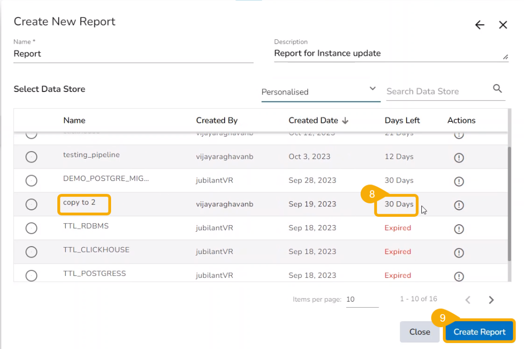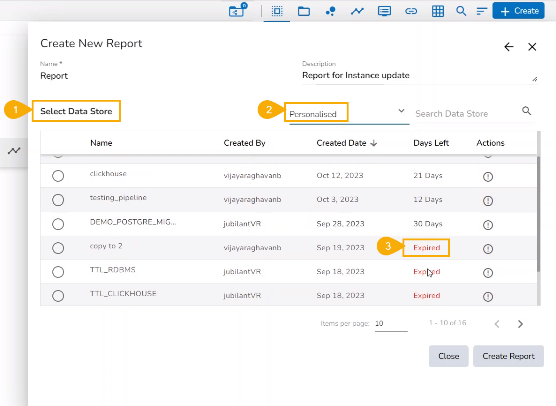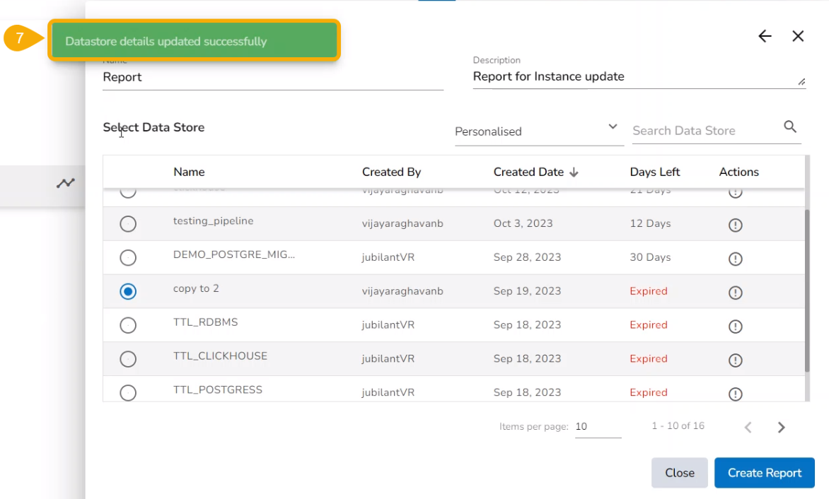 Select a Data Store from the Personalised category that has expired.