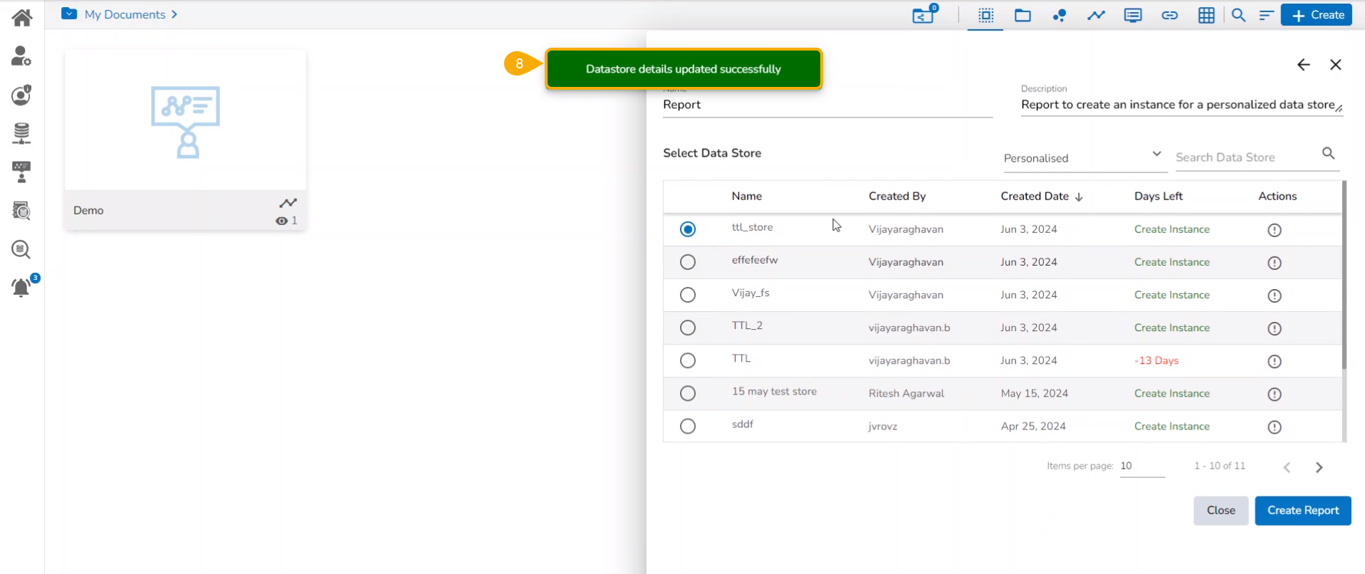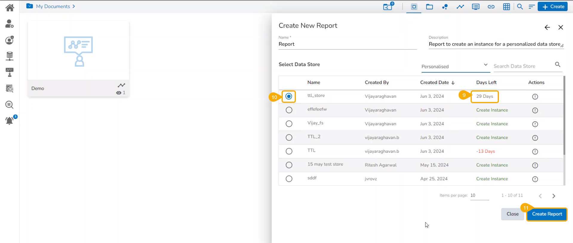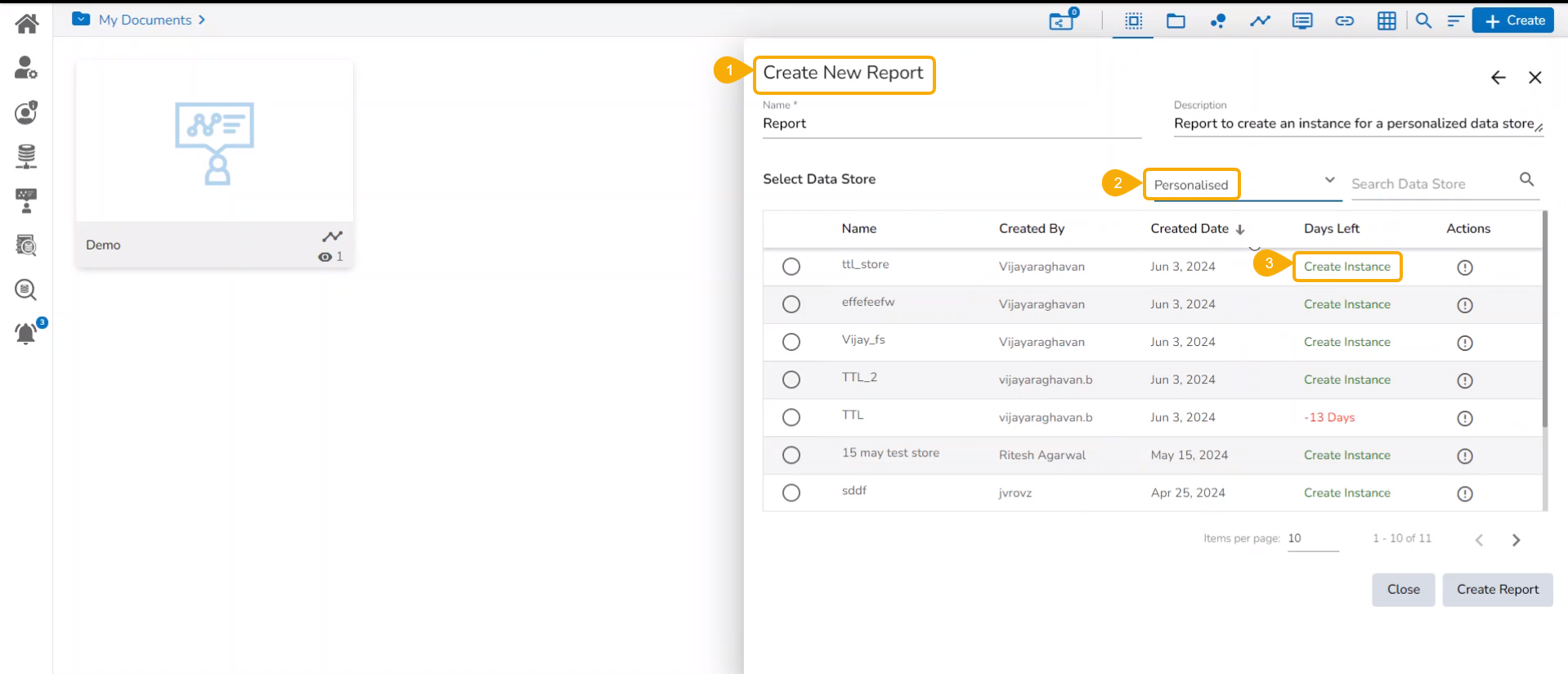 Prerequisite: The Data Store Settings must be configured from the Admin module to access the Instance functionality for the Data Store inside a Report.