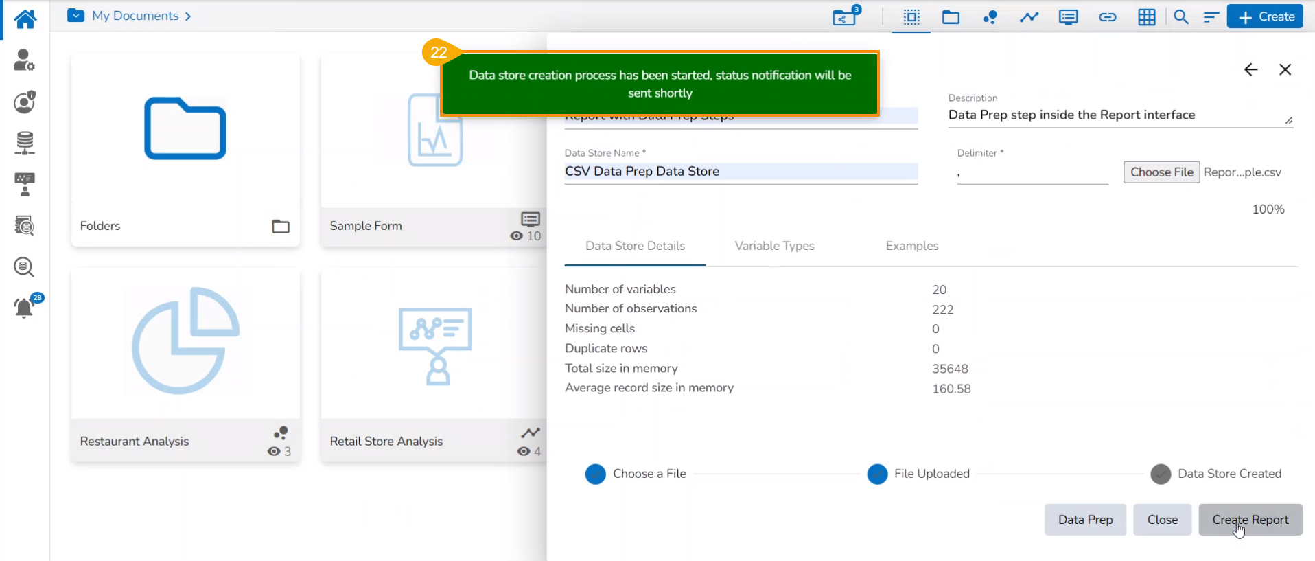 Check out the given walk-through to create a new report on top of an uploaded file that contains Data Preparation steps.