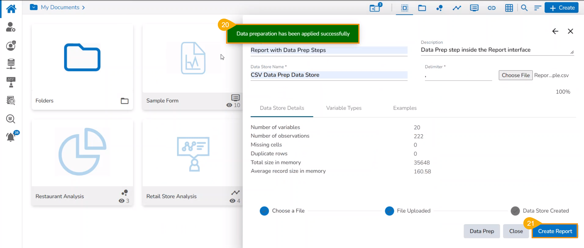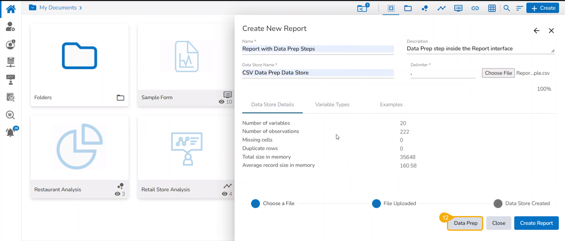 Create a new Report by implementing the Data Preparation steps to an uploaded file using the Report UI.