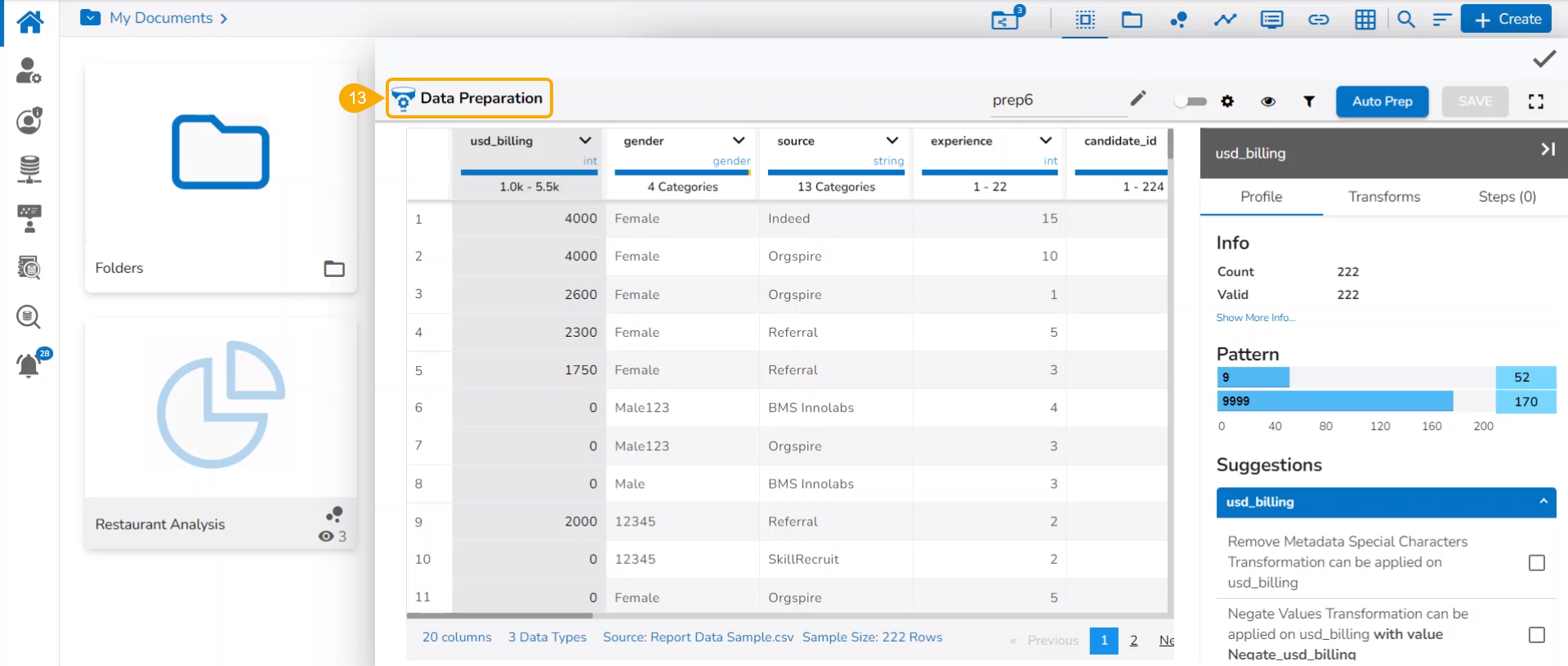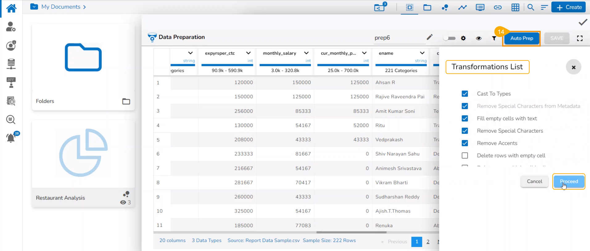 Apply the required Transforms. or Click the Auto Prep option to apply the auto-mated transforms to the selected data (In the below-given image the Auto Prep option has been chosen).