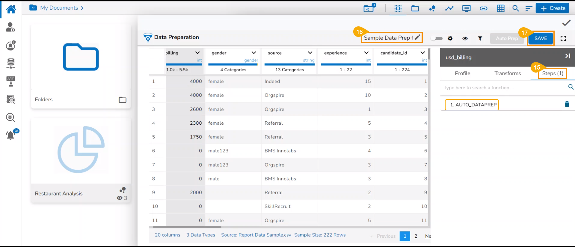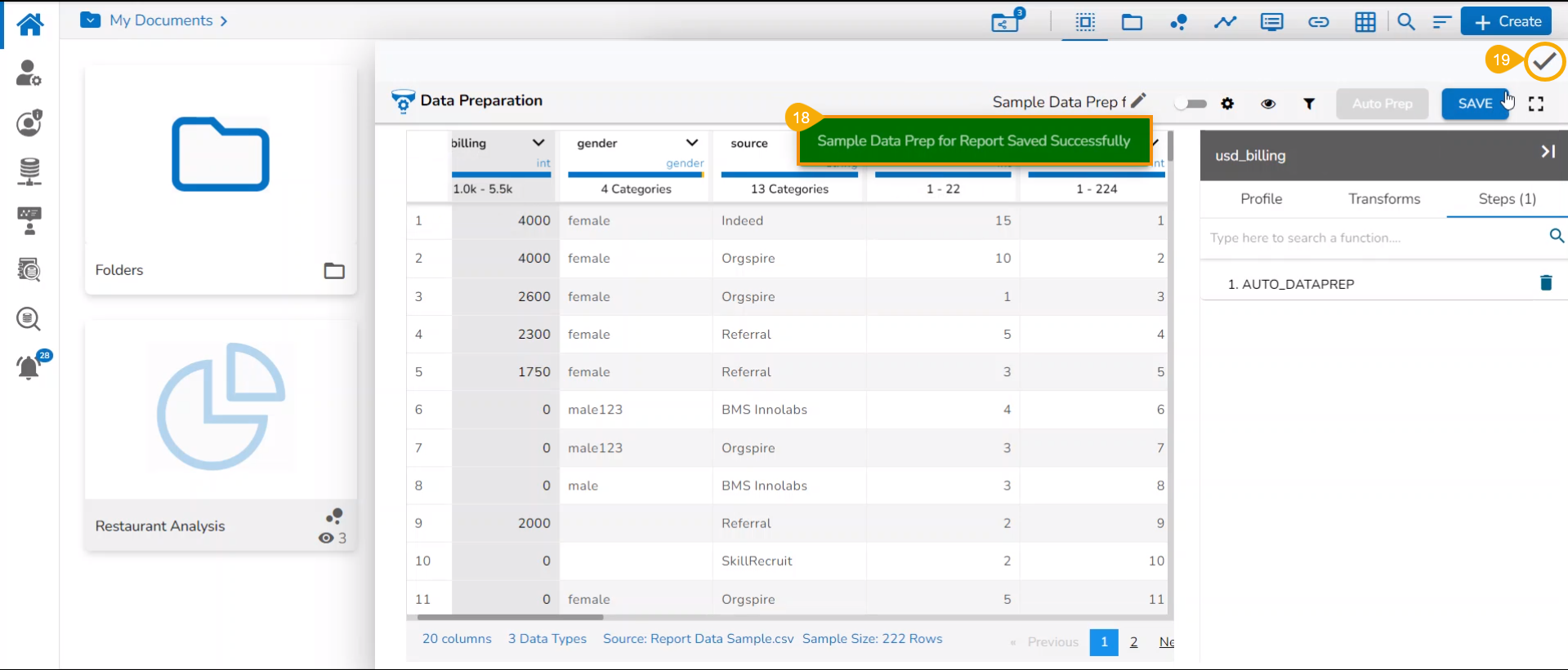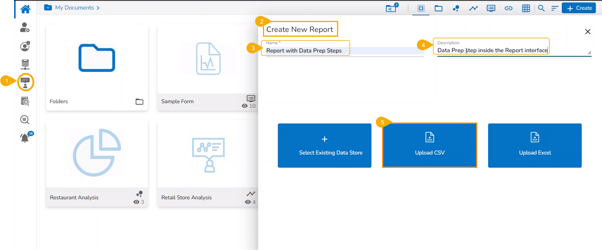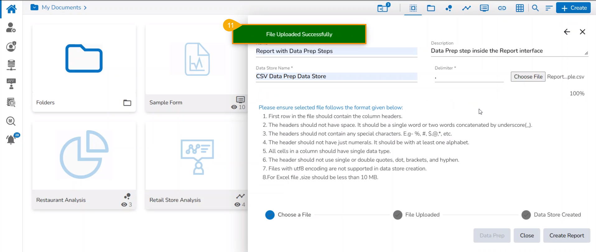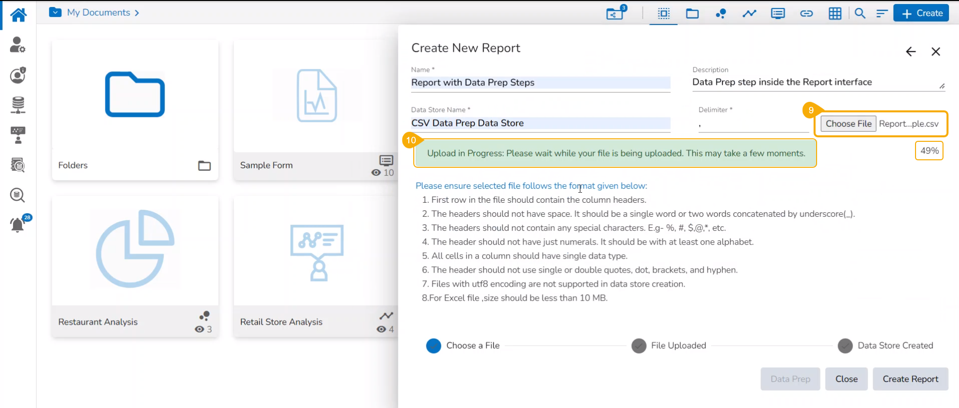 Please follow the below-given steps to create a new report based on an uploaded file containing the Data Preparation Steps: