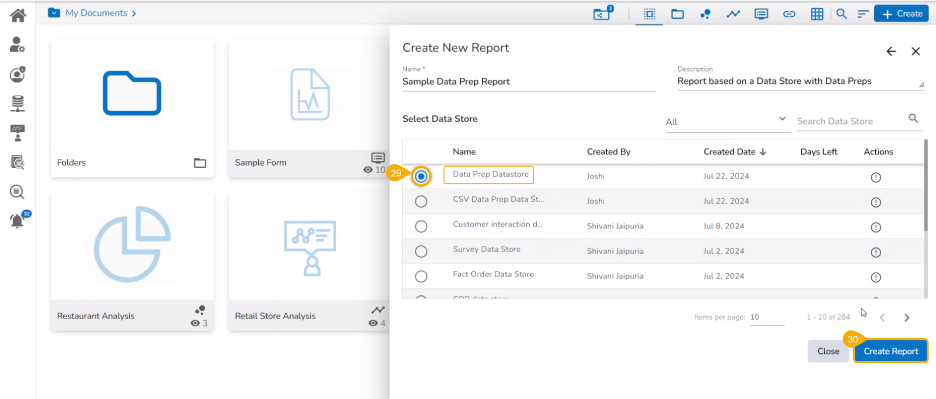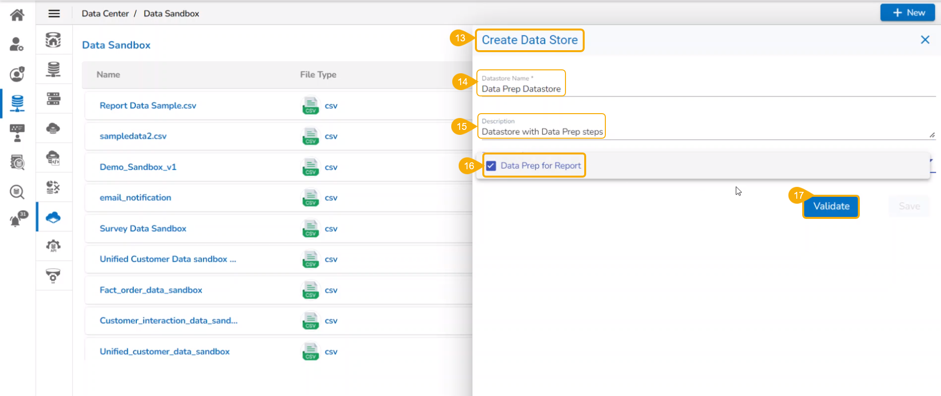 Select the data store earlier created with the Data Preparation steps using the checkbox.