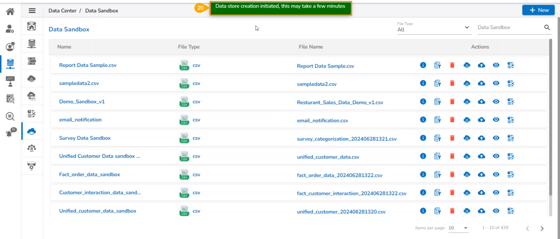 A notification ensures that the Data Store creation has been initiated and may take a few minutes.