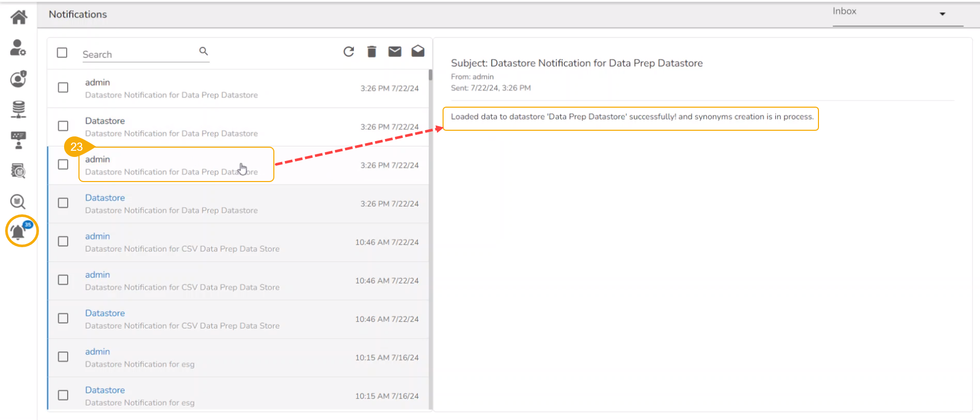 The user may open the Notifications section to check the Data Store update. It would notify that the data is loaded to the newly created Data Store.