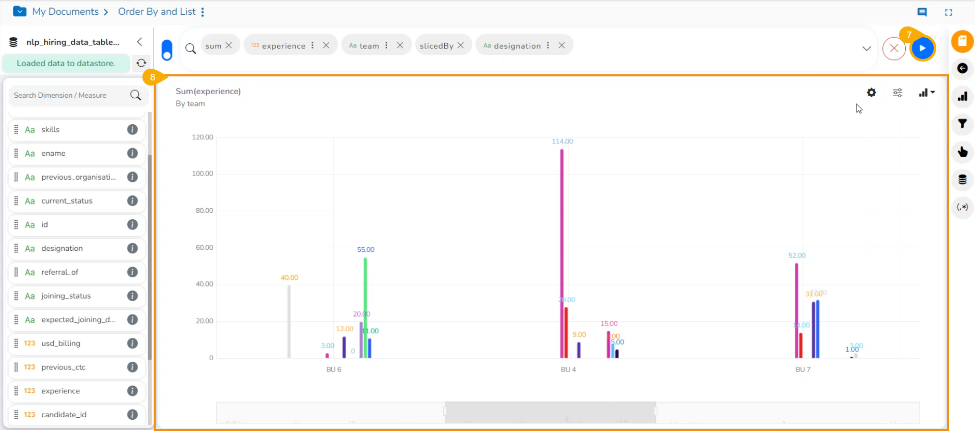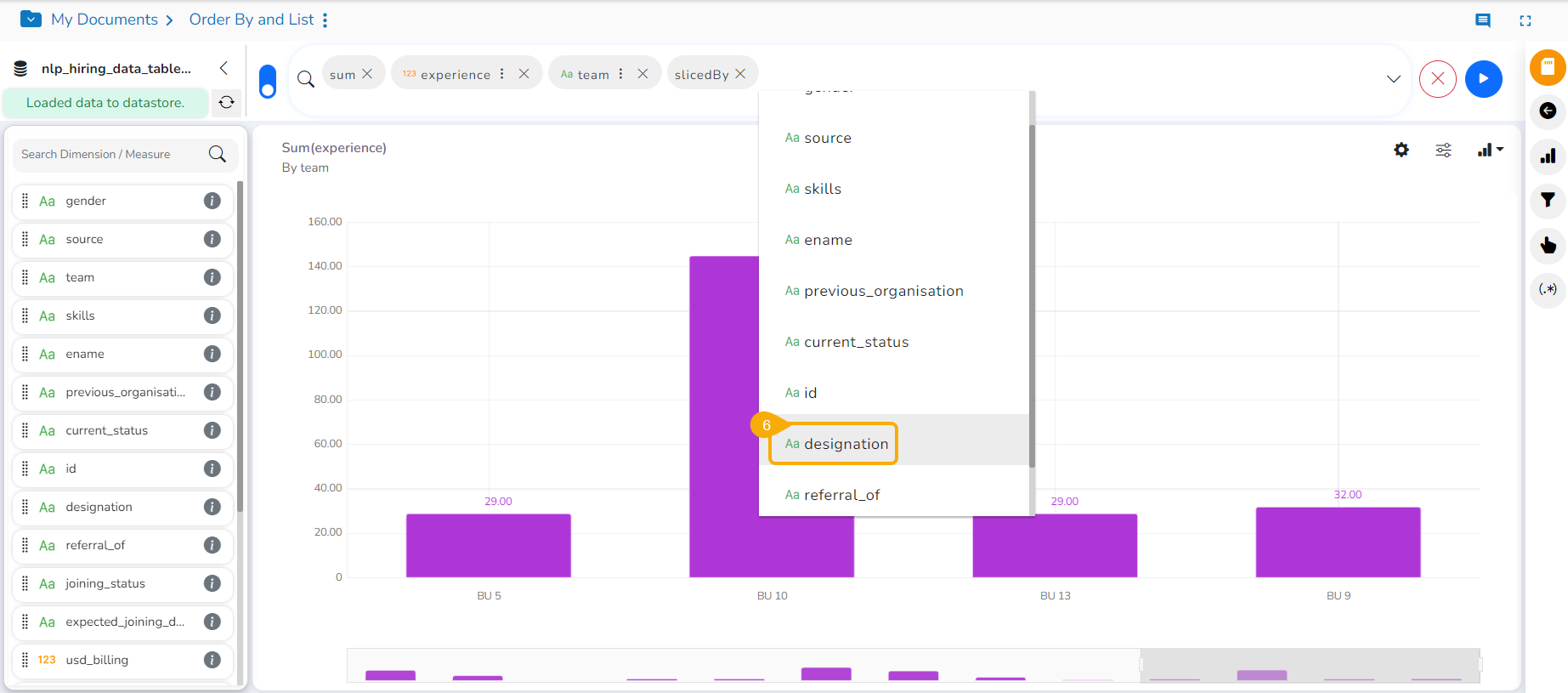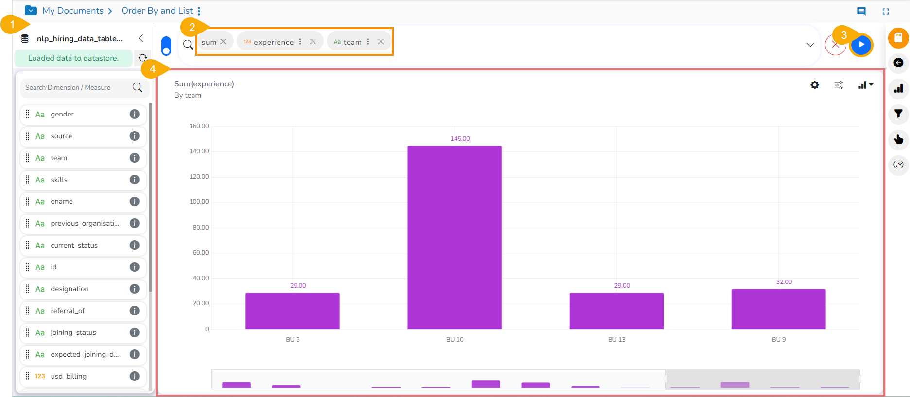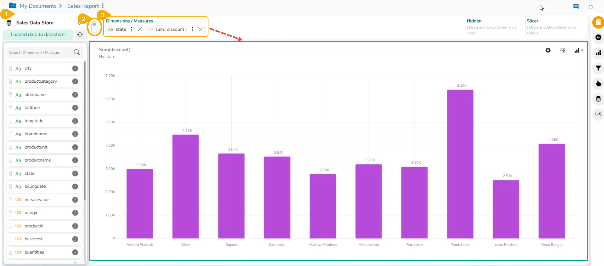 * Select the dimension and one measure to the ***Dimensions/ Measures*** column using the clicks at the top bar.