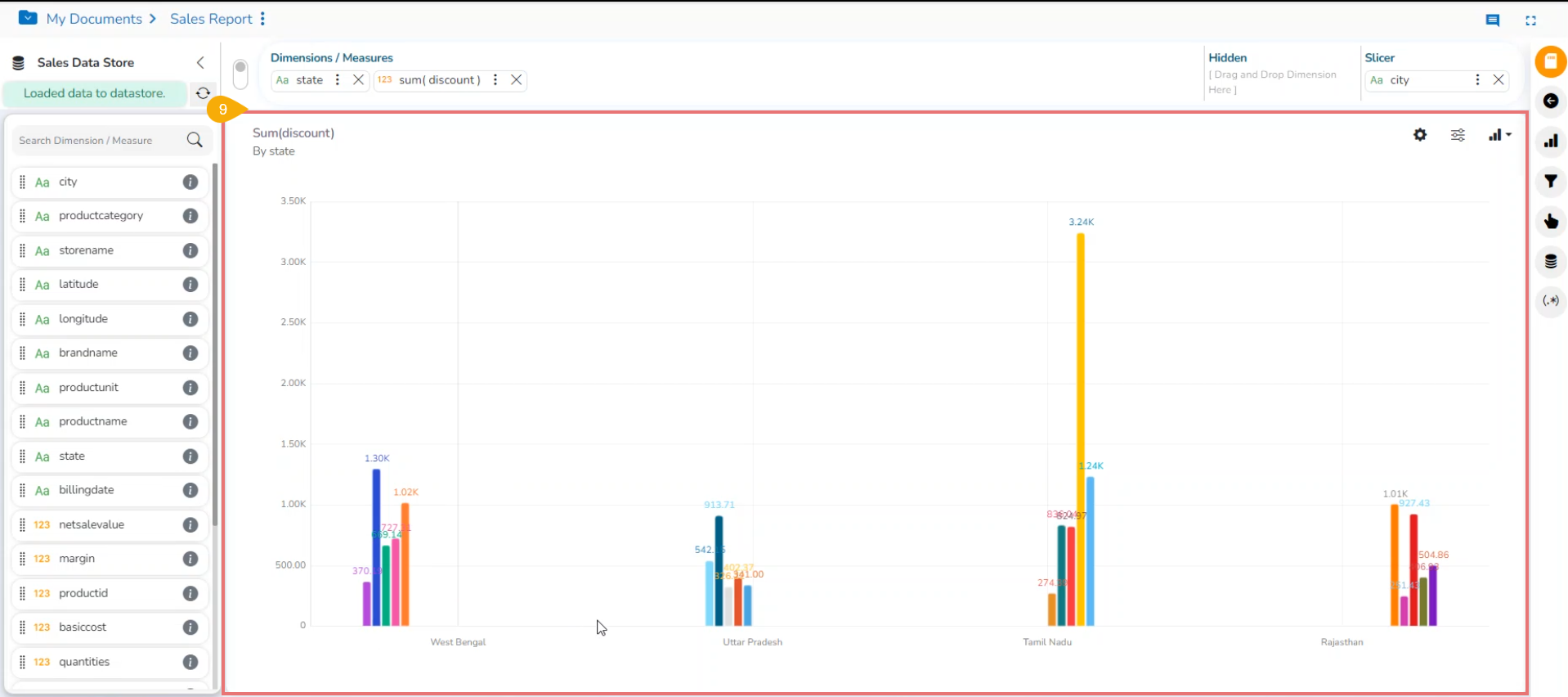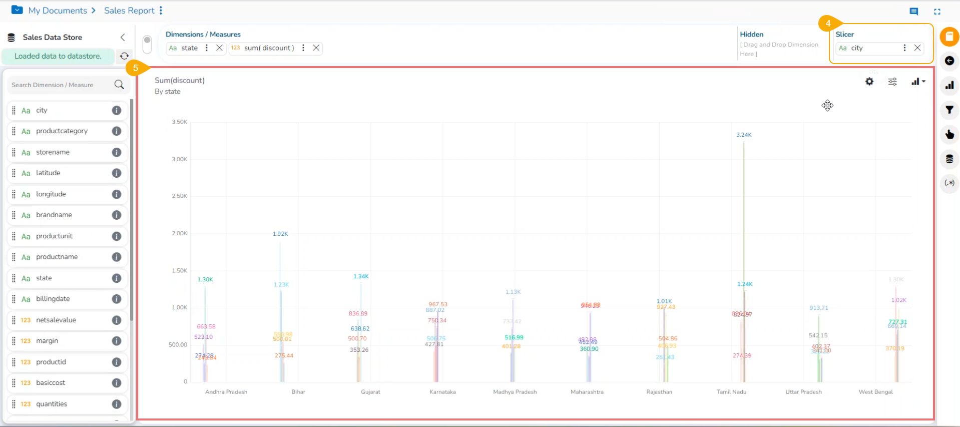 * *The Slicer supports the selection of only one dimension and one measure in the **Dimensions/Measures** space. Another dimension should be added to the **Slicer** spac&#x65;**.***