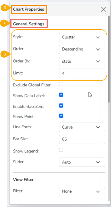 * The ***View*** gets displayed based on the selected dimension and measure. Here, Mixed chart has been selected to plot the selected dragged dimensions and measures as it supports a slicer.&#x20;