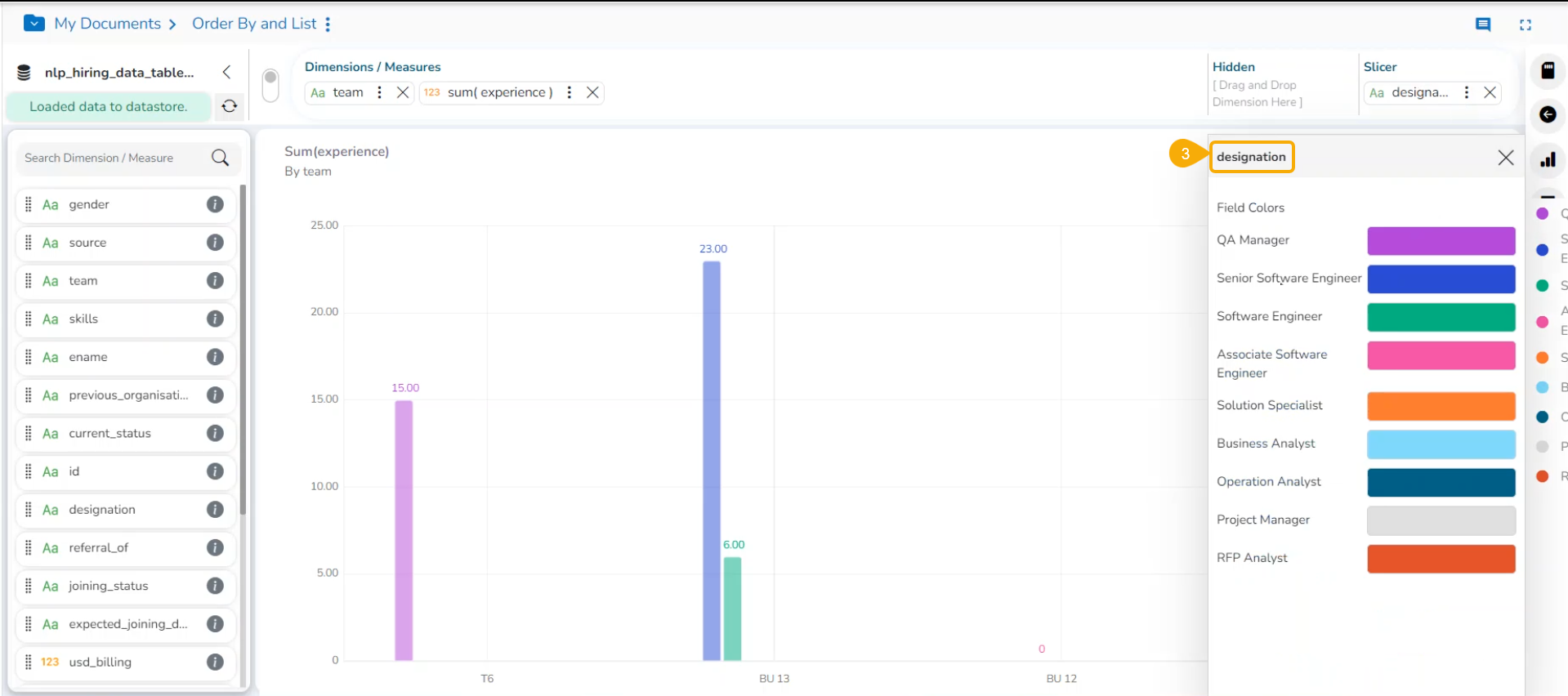 * Drag and drop one dimension and one measure to the ***Dimensions/ Measures*** column using the Design canvas.