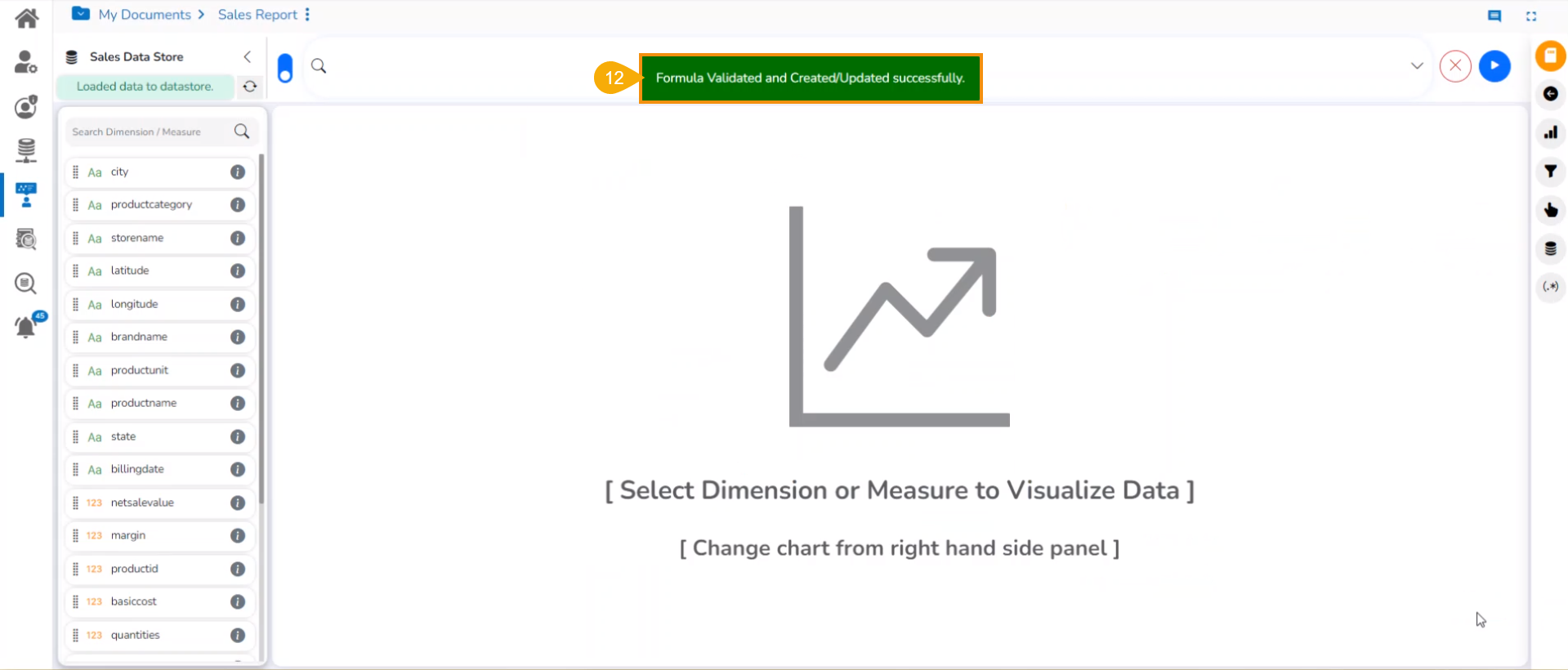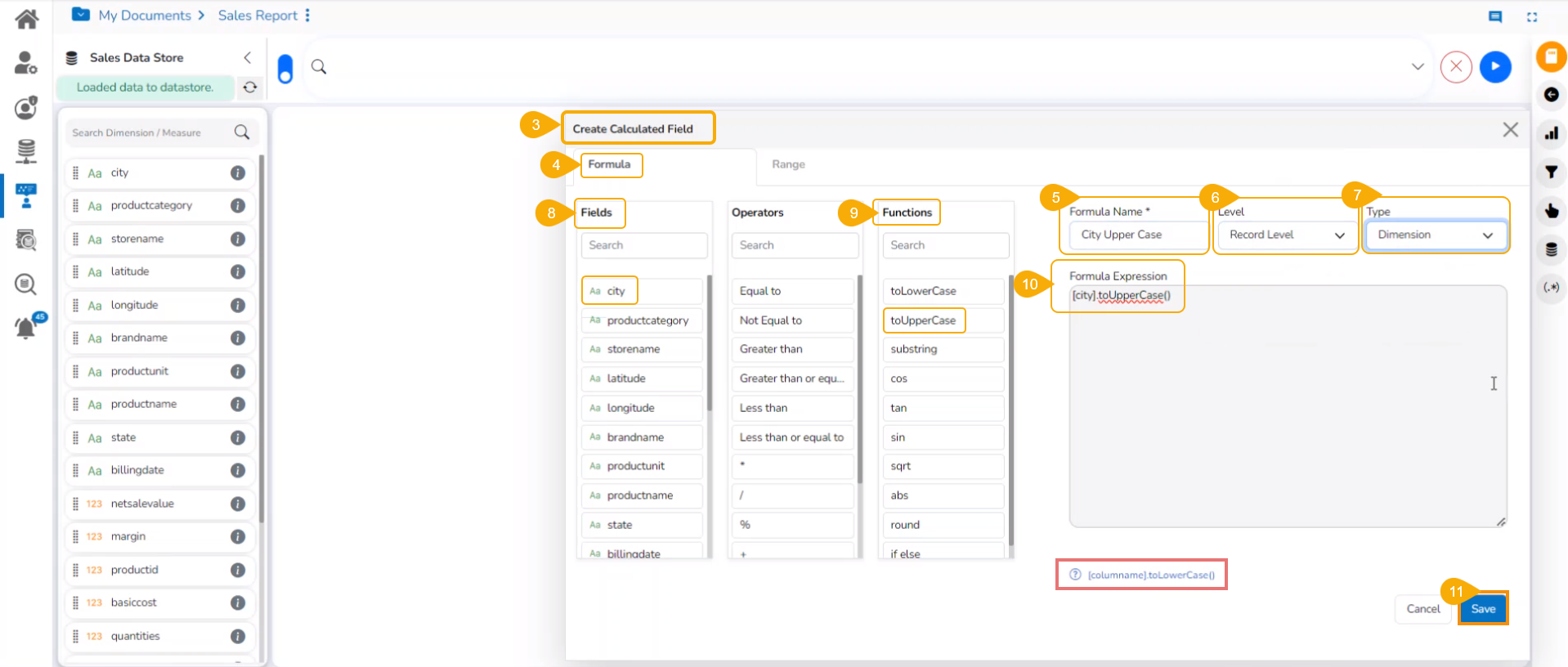 The Formula Fields created with the Record Level option can be saved as either Dimension or Measure. Based on the selected option for the Type, the displayed Fields may vary in the right-side panel.