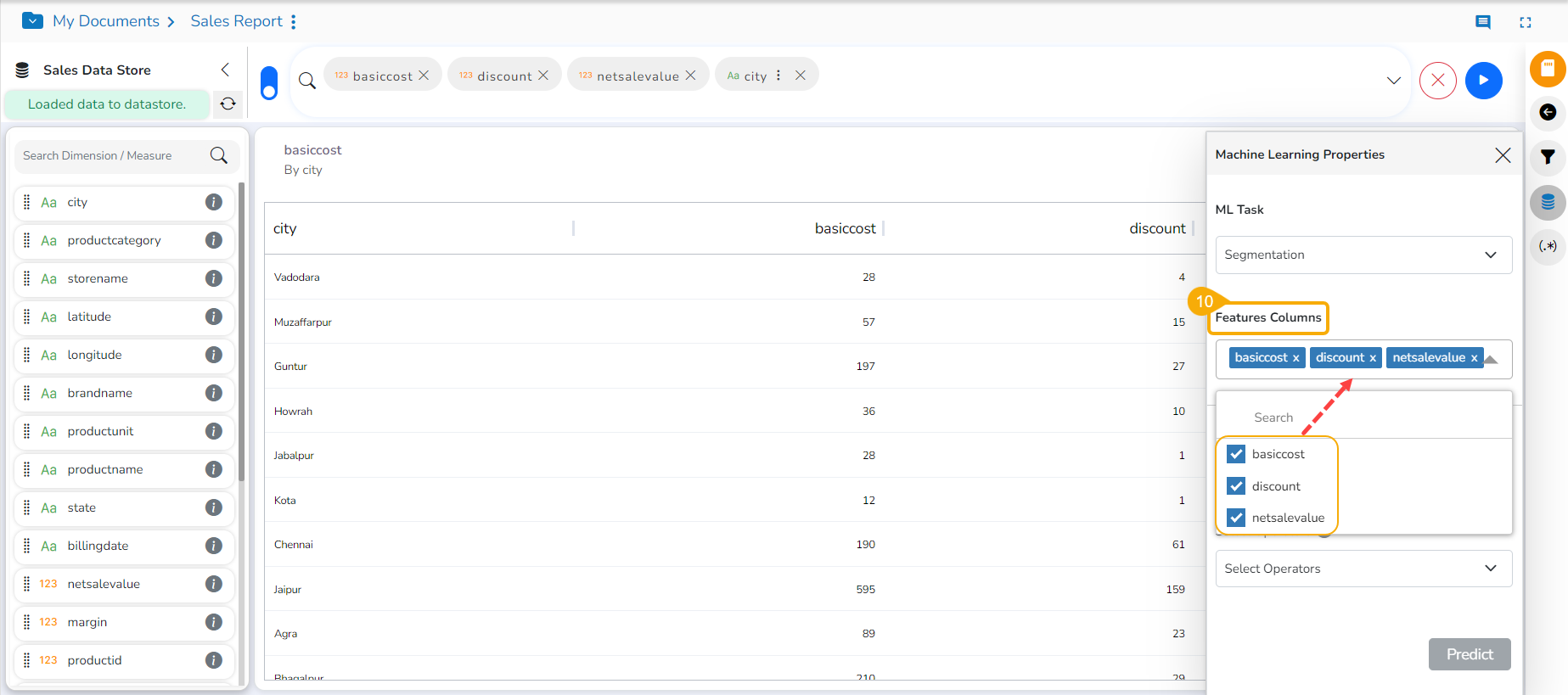 Fields specific to the selected ML Task will appear to apply it. In this case, select the Feature Columns by using the checkboxes.