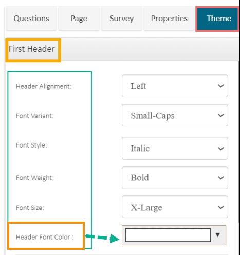 The Theme option allows the change Themes of the First Header, Second Header, and the Survey body.